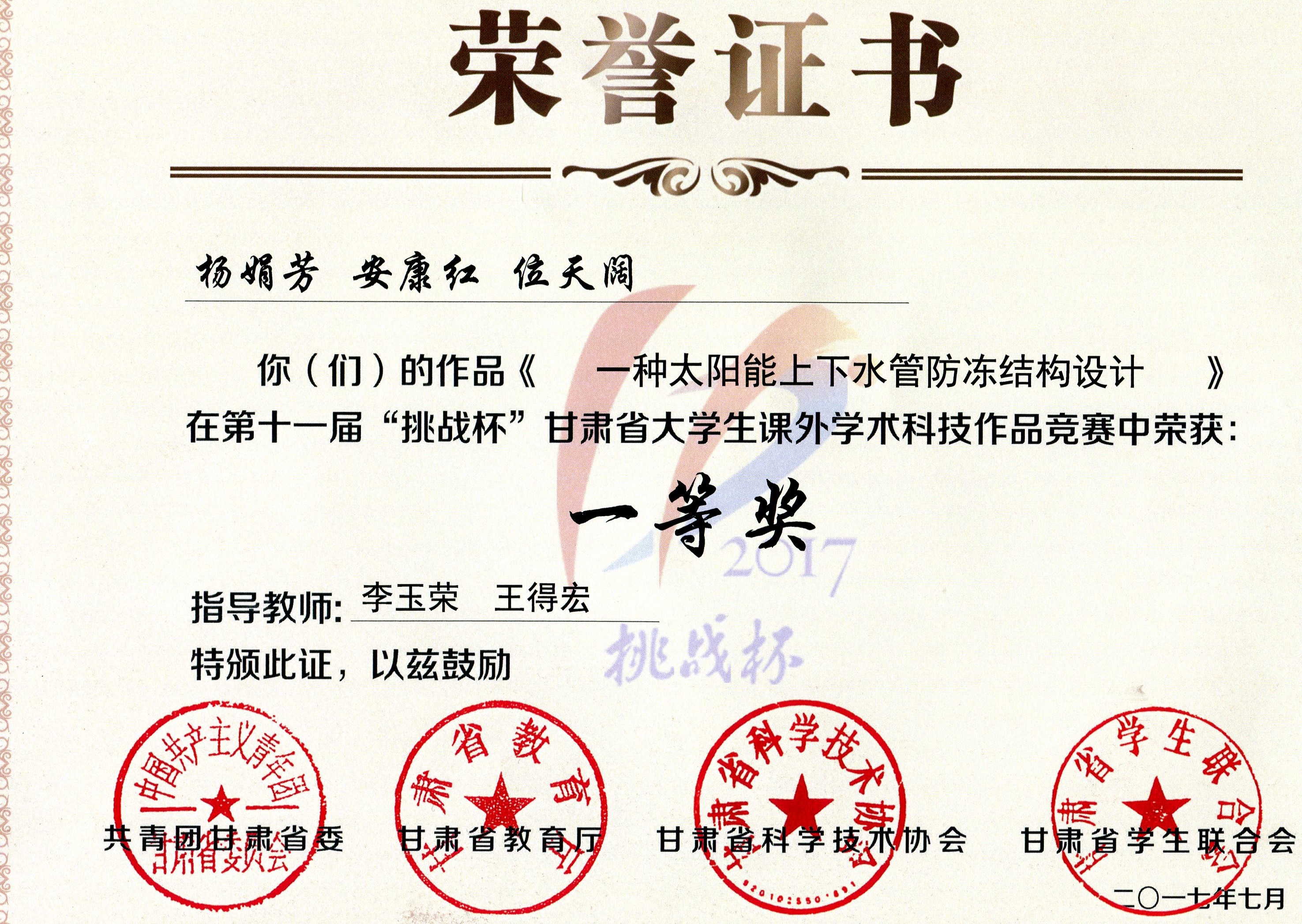 第十一屆“挑戰(zhàn)杯”甘肅省大學生課外學術(shù)科技作品競賽一等獎
