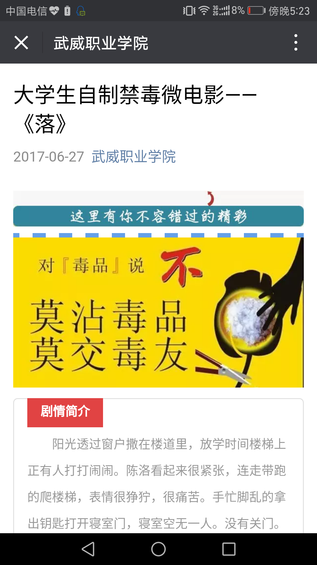 為進(jìn)一步推進(jìn)平安校園建設(shè),不斷推進(jìn)青少年毒品預(yù)防教育“6·27”工程活動(dòng)的深入開(kāi)展,增強(qiáng)師生的禁毒意識(shí),武威職業(yè)學(xué)院根據(jù)甘肅省禁毒委員會(huì)辦公室、甘肅省教育廳《關(guān)于做好2017年秋季開(kāi)學(xué)在校學(xué)生毒品預(yù)防教育工作的通知》要求,在全院范圍內(nèi)開(kāi)展了禁毒宣傳教育“五個(gè)一”活動(dòng)。