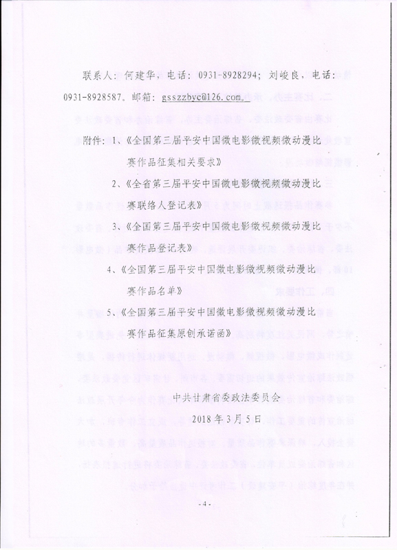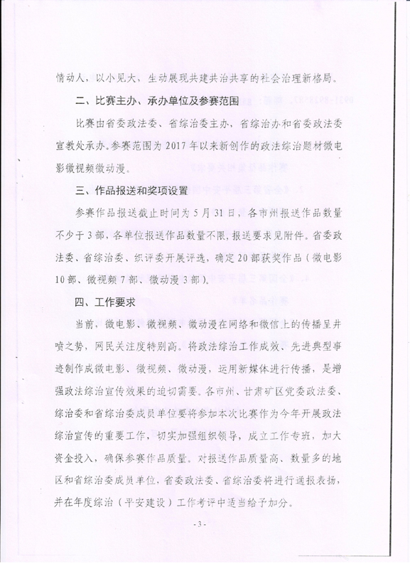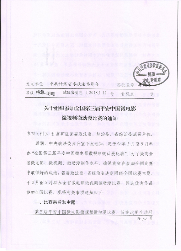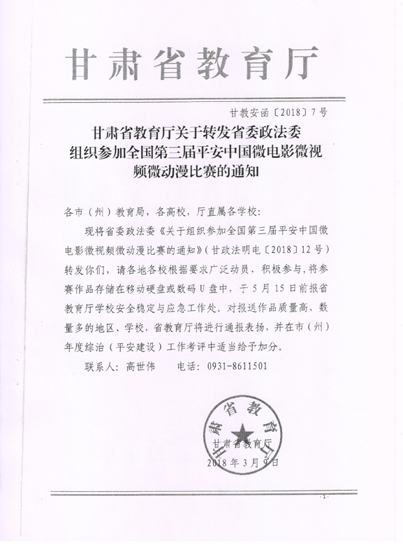 現(xiàn)將甘肅省教育廳關(guān)于轉(zhuǎn)發(fā)《省委政法委<關(guān)于組織參加全國(guó)第三屆平安中國(guó)微電影微視頻微動(dòng)漫比賽的通知>》(甘政法明電〔2018〕12號(hào))轉(zhuǎn)發(fā)你們,請(qǐng)各部門、單位根據(jù)要求廣泛動(dòng)員,積極參與。將參賽作品存儲(chǔ)在移動(dòng)硬盤或數(shù)碼U盤中,于5月10日前報(bào)宣傳統(tǒng)戰(zhàn)部辦公室,宣傳統(tǒng)戰(zhàn)部對(duì)報(bào)送作品匯總后統(tǒng)一報(bào)送省教育廳。