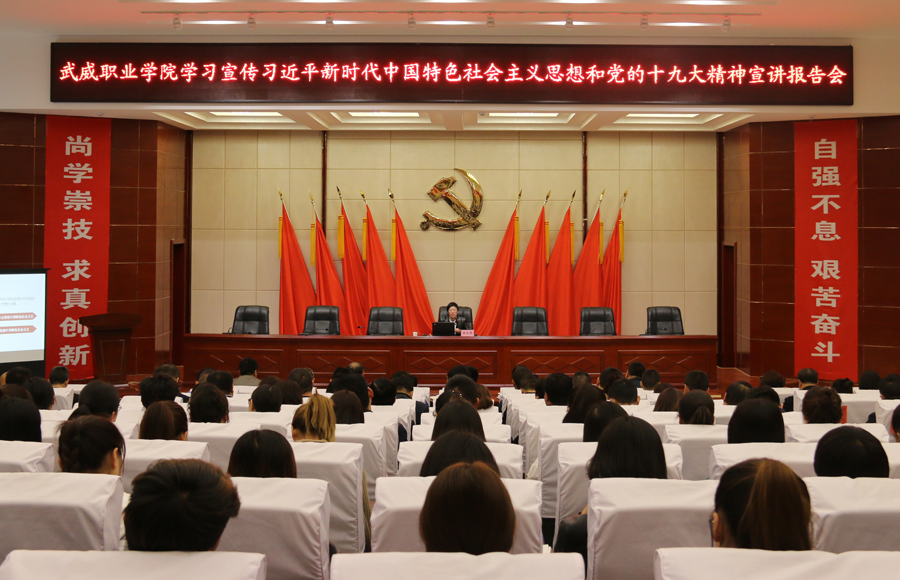 為進(jìn)一步加強(qiáng)對習(xí)近平新時代中國特色社會主義思想和黨的十九大精神的學(xué)習(xí)宣傳教育,4月9日下午,學(xué)院黨委在菁英廳舉行“武威職業(yè)學(xué)院深入學(xué)習(xí)宣傳貫徹習(xí)近平新時代中國特色社會主義思想和黨的十九大精神宣講報告會”,邀請武威市委講師團(tuán)成員、市委黨校副教授蔡生菊為學(xué)院各院系師生代表、副科級以上領(lǐng)導(dǎo)干部、直屬附屬醫(yī)院領(lǐng)導(dǎo)共計200余人作宣講報告。宣講報告會由宣傳統(tǒng)戰(zhàn)部部長王繼林主持。