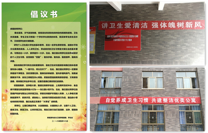 學(xué)院面向全體同學(xué)發(fā)出倡議,并在教學(xué)樓、公寓樓粘貼了倡議書(shū),倡議全體同學(xué)養(yǎng)成良好的個(gè)人衛(wèi)生習(xí)慣,自覺(jué)做到“四勤”:勤洗手腳、勤洗澡、勤剪指甲、勤換洗衣服;保持宿舍干凈整潔,及時(shí)清理垃圾、勤換洗床單被罩、室內(nèi)多通風(fēng)換氣、地面桌面擦洗干凈、舍友之間相互關(guān)心幫助,把宿舍營(yíng)造得既有家的舒適,又有家的溫暖;自覺(jué)維護(hù)和參與整治公共環(huán)境衛(wèi)生,從路遇垃圾順手撿起、上完廁所及時(shí)沖水、食品袋不要留在教室里等細(xì)小行為入手,躬親示范、感染他人,用自己的行動(dòng)打造清新、潔凈、靚麗的校園環(huán)境,無(wú)愧于“大學(xué)生”的稱(chēng)謂。學(xué)院還在教學(xué)樓和公寓樓分別懸掛了“講衛(wèi)生愛(ài)清潔強(qiáng)體魄樹(shù)新風(fēng)”、“自覺(jué)養(yǎng)成衛(wèi)生習(xí)慣 共建整潔優(yōu)美公寓”等內(nèi)容的宣傳條幅。
