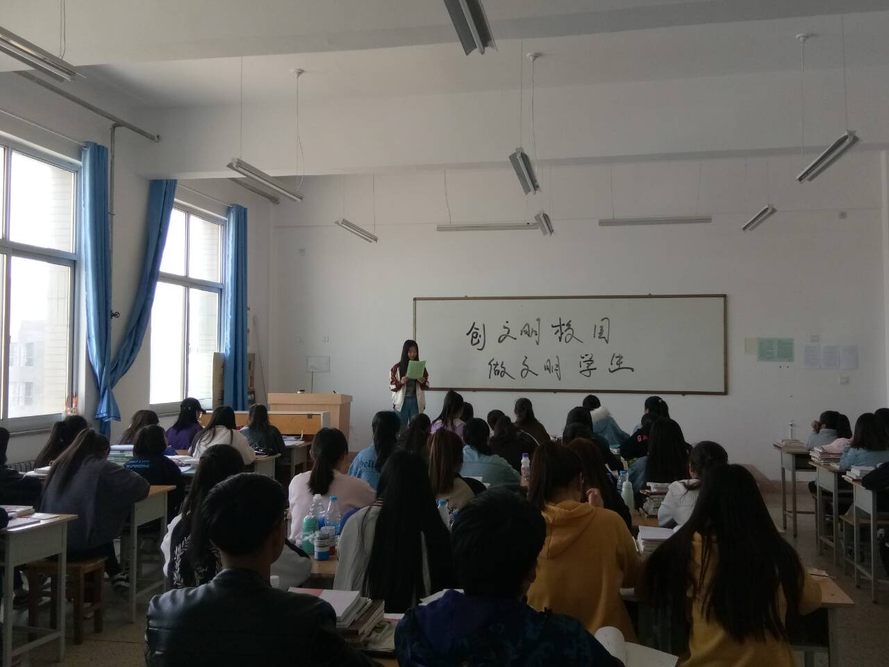4月20日,人文藝術(shù)教育系組織全體教師學(xué)習(xí)了《中共武威職業(yè)學(xué)院委員會(huì)關(guān)于成立創(chuàng)建全國文明城市工作領(lǐng)導(dǎo)小組的通知》《武威職業(yè)學(xué)院創(chuàng)建全國文明城市三年規(guī)劃(2018-2020)》《武威職業(yè)學(xué)院創(chuàng)建全國文明城市2018年工作實(shí)施方案》文件精神,通過教研室活動(dòng),認(rèn)真學(xué)習(xí)了《你我攜手 共創(chuàng)文明》倡議書,自覺遵守教師行為守則和管理規(guī)范,自覺維護(hù)辦公室環(huán)境,以實(shí)際行動(dòng)踐行文明承諾,以模范行為影響身邊人、身邊事。學(xué)生通過主題班會(huì),學(xué)習(xí)了《創(chuàng)文明校園 做文明學(xué)生》和《共同創(chuàng)建文明城市》倡議書,自覺愛護(hù)公物,不亂貼亂畫,不亂扔垃圾,不講粗話臟話,不隨地吐痰,不破壞公共設(shè)施,用實(shí)際行動(dòng)踐行社會(huì)主義核心價(jià)值觀。