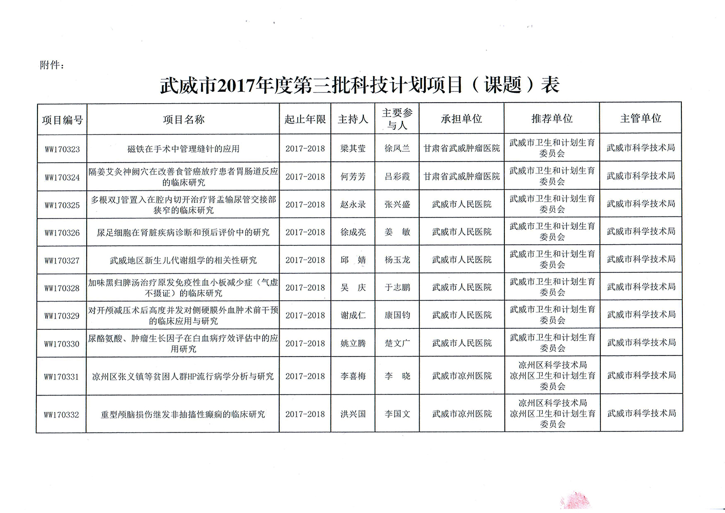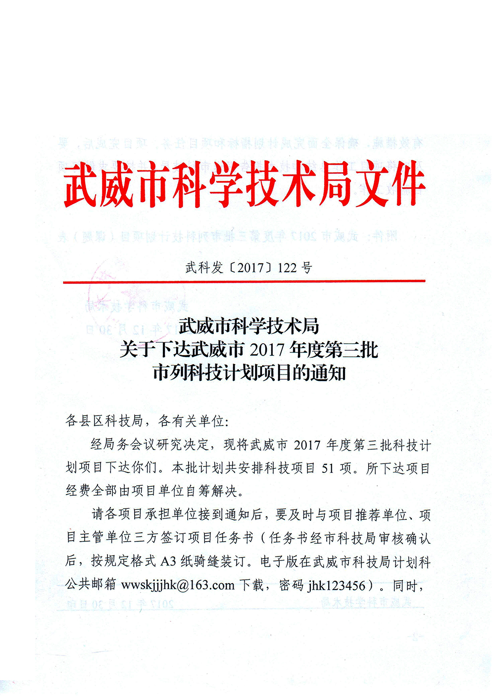 轉(zhuǎn)發(fā)武威市科學(xué)技術(shù)局關(guān)于下達(dá)武威市2017年度第三批市列科技計(jì)劃項(xiàng)目的通知