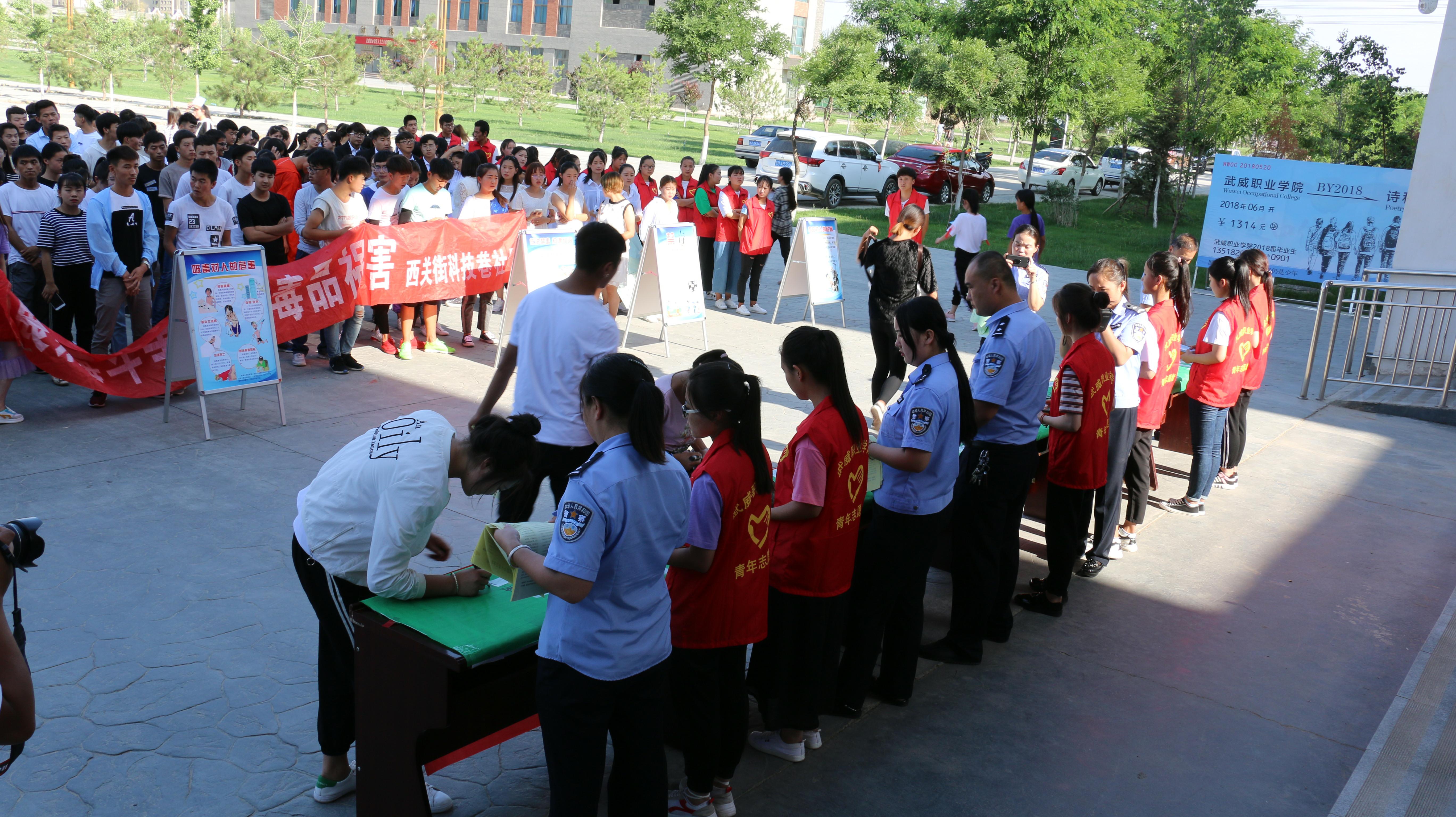 6月26日上午,學(xué)院組織50多名禁毒志愿者參加了全市“6.26”國際禁毒日大型主題宣傳活動。下午,學(xué)院相關(guān)部門聯(lián)合轄區(qū)派出所在大學(xué)生活動中心前舉行了“6.26”國際禁毒日主題宣傳活動。