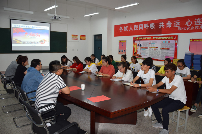 ???? 為認(rèn)真貫徹落實《學(xué)院第15個民族團(tuán)結(jié)進(jìn)步宣傳月活動實施方案》,6月12日,現(xiàn)代農(nóng)業(yè)技術(shù)系在行樹樓教學(xué)區(qū)309會議室開展民族團(tuán)結(jié)月系列活動。系黨總支書記晏素珍、龔建軍、蔡飛老師及全系少數(shù)民族學(xué)生參加會議,會議由系輔導(dǎo)員蔡海老師主持。
