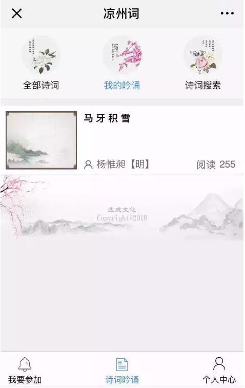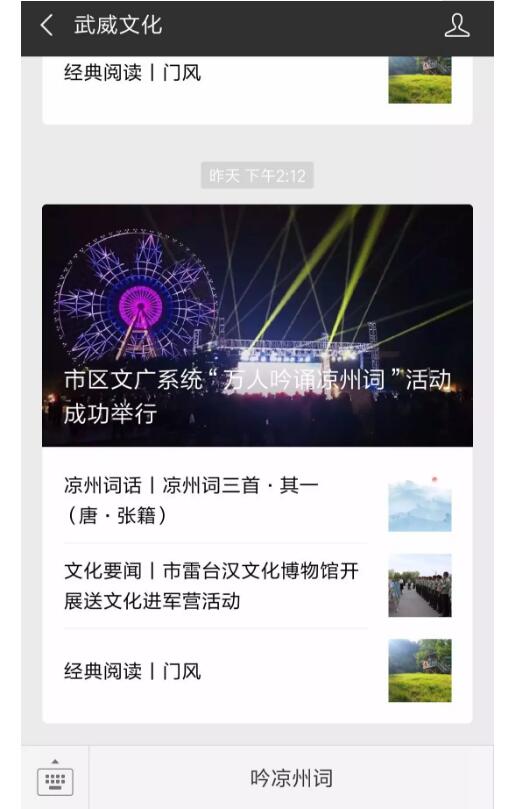 1.打開“武威文化”公眾號,點(diǎn)擊最下方“吟涼州詞”進(jìn)入活動(dòng)“萬人吟誦涼州詞”活動(dòng)頁面。