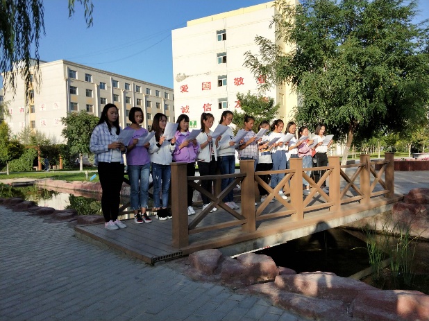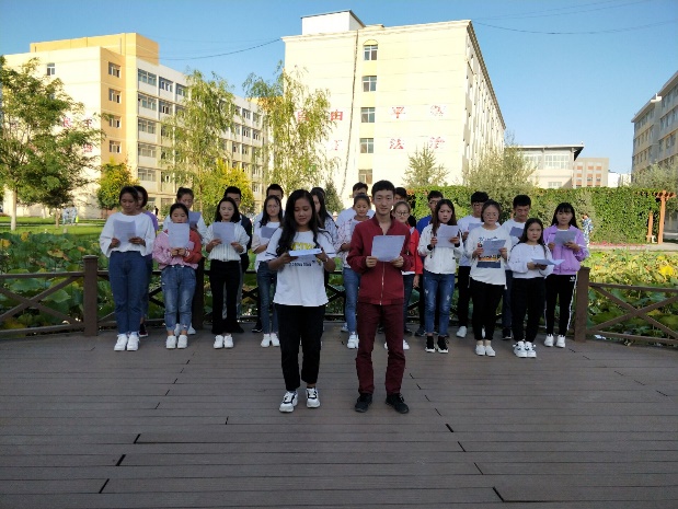 同學(xué)們分別在圖書館、荷花池等地方進(jìn)行詩(shī)詞朗誦及詩(shī)詞交流。朗誦的詩(shī)詞主要有明代張恒的《涼州詞》、唐代李白的《關(guān)山月》及唐代王昌齡的《從軍行》等多篇優(yōu)秀作品。