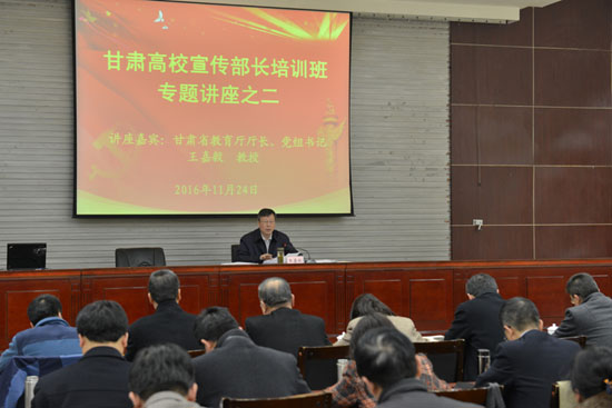 王嘉毅在專題講座中介紹了甘肅高等教育現(xiàn)狀、存在問(wèn)題和“十三五”發(fā)展目標(biāo)。他指出,高校宣傳思想工作主要任務(wù)要把學(xué)習(xí)貫徹落實(shí)黨的十八大以來(lái)的重大部署,特別是六中全會(huì)精神和習(xí)近平總書記系列重要講話精神作為重要任務(wù)來(lái)抓;要把貫徹落實(shí)中宣部、教育部黨組《關(guān)于加強(qiáng)和改進(jìn)高校宣傳思想工作隊(duì)伍建設(shè)的意見(jiàn)》精神和省委辦公廳、省政府辦公廳《關(guān)于進(jìn)一步加強(qiáng)和改進(jìn)新形勢(shì)下高校宣傳思想工作的實(shí)施意見(jiàn)》作為重要任務(wù)來(lái)抓;要把進(jìn)一步弘揚(yáng)社會(huì)主義核心價(jià)值觀、加強(qiáng)正面宣傳、傳播正能量作為重要任務(wù)來(lái)抓。通過(guò)準(zhǔn)確把握新形勢(shì)下高校宣傳思想工作的動(dòng)態(tài),分析研判我省高校宣傳思想工作面臨的問(wèn)題,切實(shí)加強(qiáng)高校意識(shí)形態(tài)領(lǐng)域的工作,提升網(wǎng)絡(luò)輿情掌控應(yīng)對(duì)能力,積極開(kāi)展馬克思主義研究,全面繁榮哲學(xué)社會(huì)科學(xué),提高覺(jué)悟,凝聚共識(shí),強(qiáng)化措施,全面推動(dòng)高校宣傳思想工作質(zhì)量提升和創(chuàng)新發(fā)展。