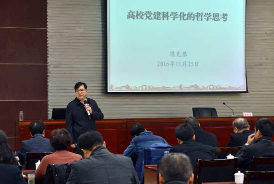 陳克恭在題為《高校黨建科學(xué)化的哲學(xué)思考》的講座中,以其獨(dú)特視角通過(guò)回顧中國(guó)近代史,闡明了中國(guó)共產(chǎn)黨執(zhí)政的客觀實(shí)在性。他認(rèn)為,要用中國(guó)智慧、中國(guó)思維把馬克思主義和西方科學(xué)有機(jī)統(tǒng)一起來(lái),構(gòu)建具有中國(guó)特色、中國(guó)風(fēng)格、中國(guó)氣派的哲學(xué)社會(huì)科學(xué)體系。并以西北師大為例,就大學(xué)治理體系的現(xiàn)代化提出了自己的思考。