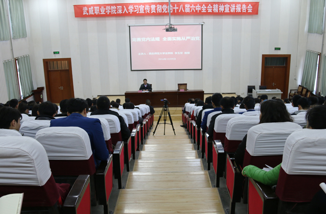 為全面準(zhǔn)確學(xué)習(xí)宣傳黨的十八屆六中全會(huì)精神,12月9日上午,學(xué)院在尚德樓正德廳舉辦“深入學(xué)習(xí)宣傳貫徹黨的十八屆六中全會(huì)精神宣講報(bào)告會(huì)”,邀請(qǐng)西北師范大學(xué)教授李玉璧作題為《完善黨內(nèi)法規(guī) 全面實(shí)施從嚴(yán)治黨》的宣講報(bào)告。學(xué)院副院長王永緒、潘玉華、田迎春,中層干部及師生代表200余人參加報(bào)告會(huì)。田迎春主持宣講報(bào)告會(huì)。
