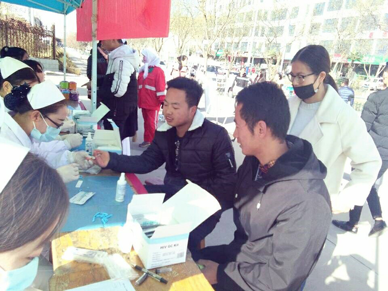 11月17日開始利用周末時間在武威文化廣場、武威職業(yè)學(xué)院門口等地開展了免費(fèi)檢測艾滋病與知艾防艾知識宣傳活動?;顒游藦V大師生及路人,組織井然有序,活動場面顯得忙而不亂。在護(hù)理系紅絲帶協(xié)會志愿者與武威市疾控中心人員嫻熟的操作下,通過指尖采血,HIV病毒膠體金法檢測,共檢測了80余人,檢測速度快,精準(zhǔn)度高。檢測結(jié)束后,向檢測者贈送活動宣傳紀(jì)念品。此次檢測活動采取保密制,保護(hù)檢測者的一切信息。