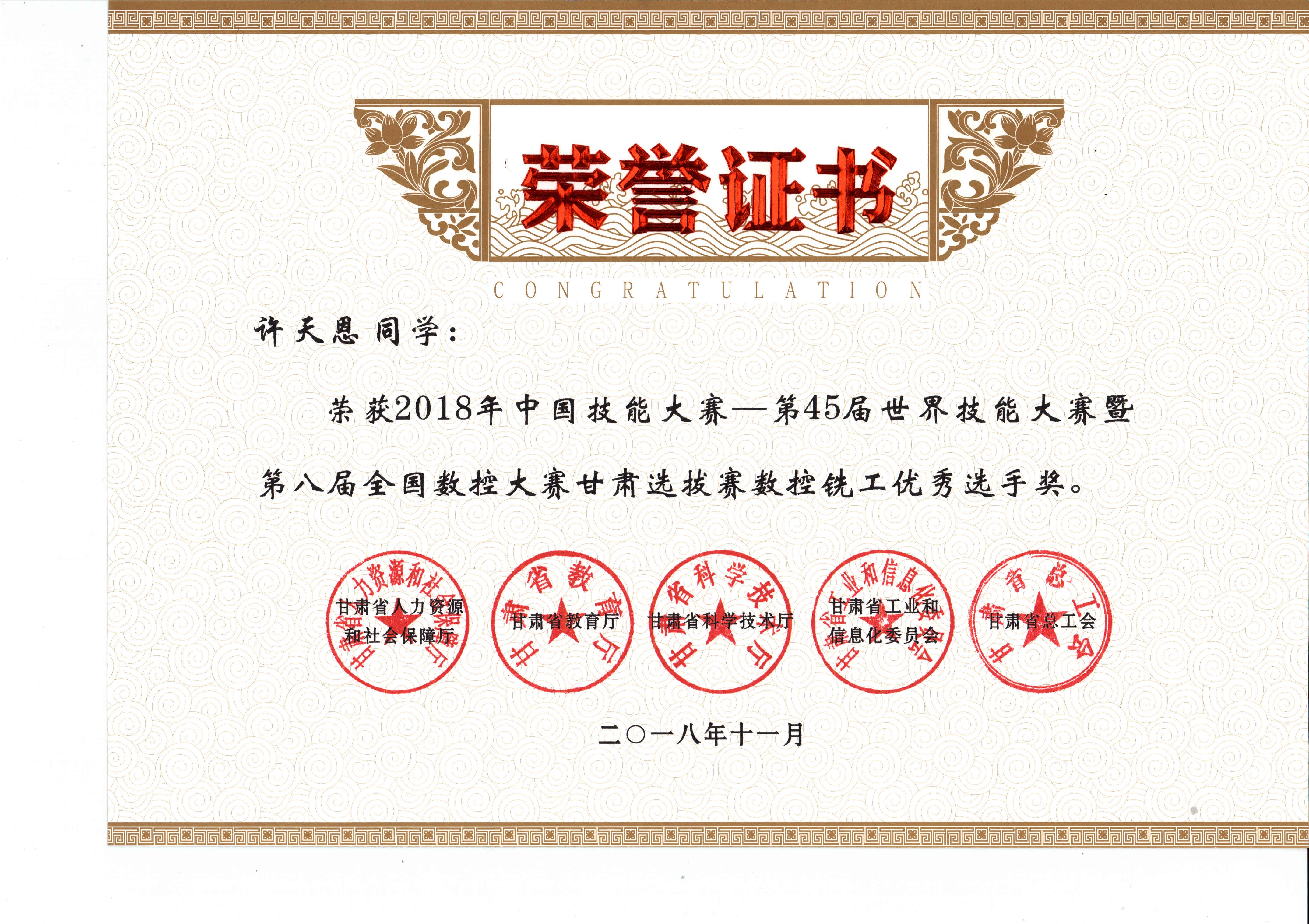 2018年中國技能大賽--第45屆世界技能大賽暨第八屆全國數(shù)控大賽甘肅選拔賽(數(shù)控銑工項目)獲獎證書