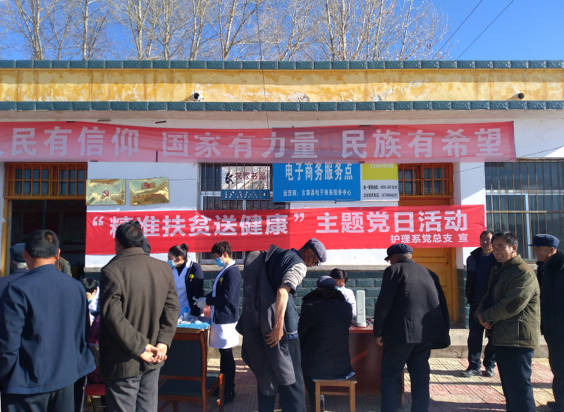 為深入學習宣傳貫徹黨的十九大精神及健康扶貧等惠民政策,減少出現“因病致貧”、“因病返貧”,11月23日,護理系黨總支組織黨員教師到我院精準扶貧點古浪縣黑松驛鎮(zhèn)尚家臺村開展“健康扶貧,送醫(yī)送藥”主題黨日活動。