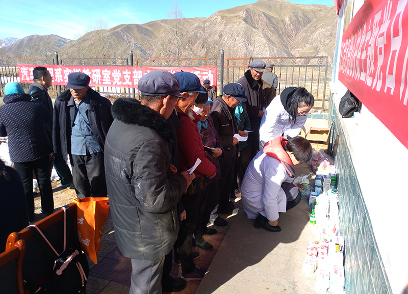 到達目的地后,黨員們不顧辛勞,分成兩組,一組由護理系黨總支書記張建輝帶領前往臥病在床的扶貧對象家里,親切詢問病情及家里近況,送上常備藥品。另一組在當地村部進行義診活動,醫(yī)護人員仔細給村民們進行體檢,耐心解答、細心診治;對前來問診的村民認真進行血壓、血糖、丙肝等項目的檢測、免費發(fā)放藥品并對糖尿病、高血壓等慢性病的飲食、活動和用藥進行指導,普及衛(wèi)生常識和健康知識。醫(yī)護人員的精心服務讓村民們倍感欣慰,受到了他們的熱烈歡迎和一致稱贊。