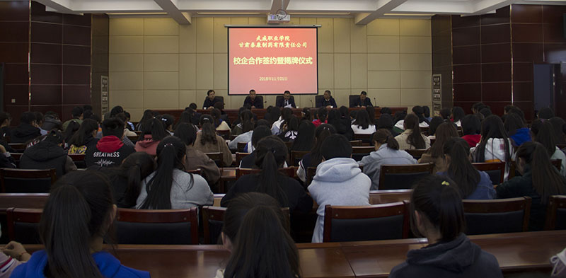 為提高人才培養(yǎng)質(zhì)量和辦學(xué)水平,加強(qiáng)校企協(xié)同育人機(jī)制建設(shè),11月1日下午,藥學(xué)系與甘肅泰康制藥有限責(zé)任公司校企合作共建“就業(yè)實(shí)習(xí)基地”簽約揭牌儀式在行樹樓北側(cè)會(huì)議室隆重舉行。甘肅泰康制藥有限責(zé)任公司投資方—北京久朝集團(tuán)產(chǎn)業(yè)中心總監(jiān)楊宏超、公司總工程師毛著鴻、財(cái)務(wù)總監(jiān)郝敏等企業(yè)領(lǐng)導(dǎo)出席本次儀式。學(xué)院教務(wù)處處長(zhǎng)仲生仁、招生就業(yè)處處長(zhǎng)蔡柱山、藥學(xué)系主任魏潤(rùn)明、副主任楊建美、黨總支副書記單光年及藥學(xué)系160余名師生參加了此次簽約揭牌儀式。儀式由魏潤(rùn)明主持。