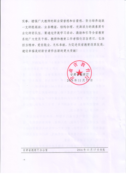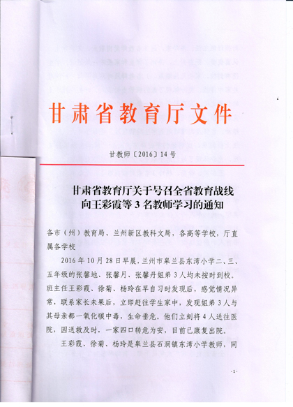 現(xiàn)將《甘肅省教育廳關(guān)于號召全省教育戰(zhàn)線向王彩霞等3名教師學(xué)習(xí)的通知》復(fù)印給你們,請認(rèn)真組織所屬教職工學(xué)習(xí)王彩霞、徐菊 、楊玲3名教師愛崗敬業(yè)、無私奉獻(xiàn)、愛心救人的先進(jìn)事跡。積極在院團(tuán)委、系團(tuán)總支,輔導(dǎo)員和班主任等學(xué)生管理隊(duì)伍中展開學(xué)習(xí)研討活動,深入踐行社會主義核心價(jià)值觀,切實(shí)加強(qiáng)學(xué)院意識形態(tài)領(lǐng)域工作,唱響主旋律,大力弘揚(yáng)正能量。