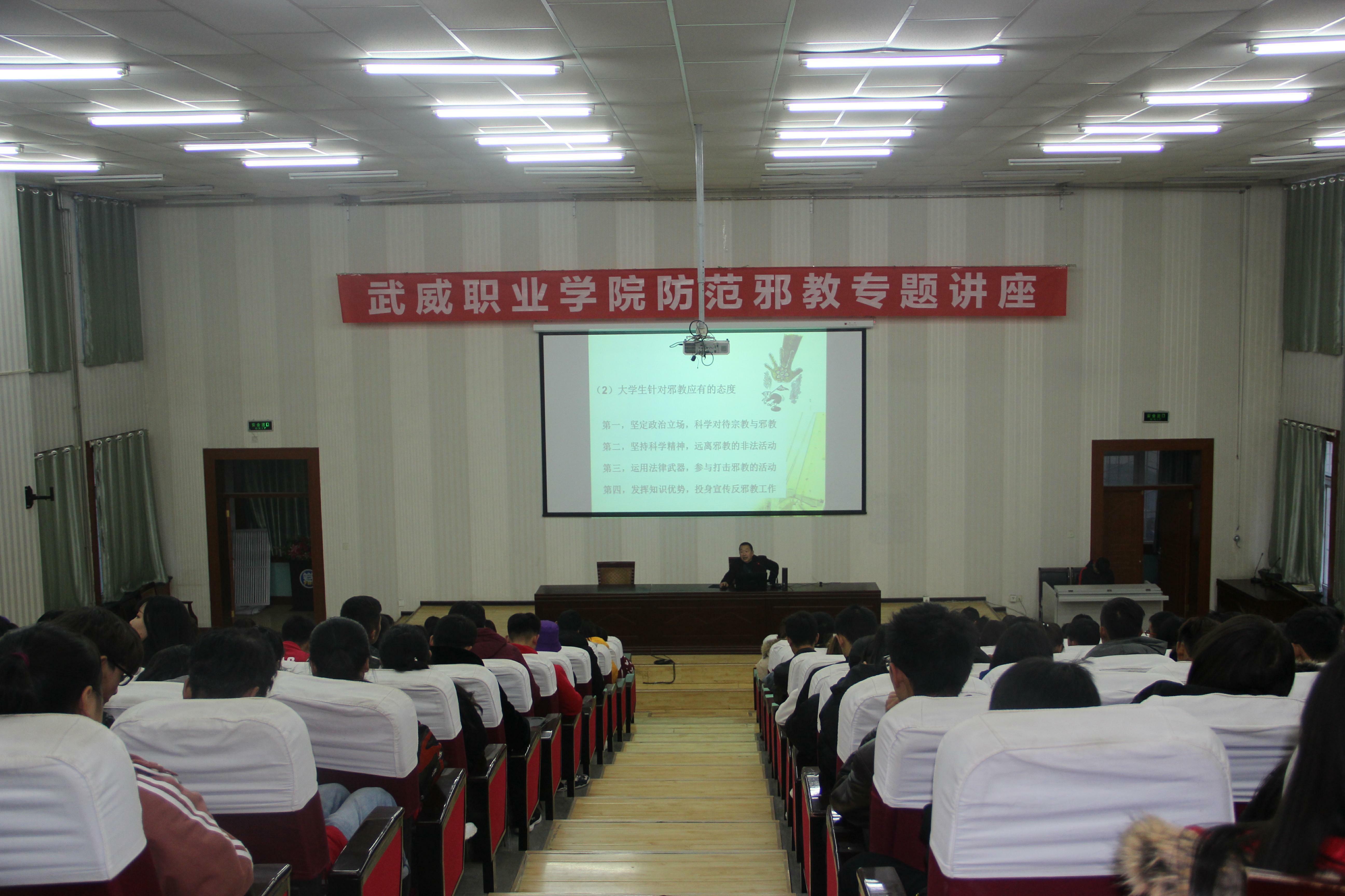 為進(jìn)一步增強(qiáng)師生防范邪教意識,提高識別邪教、抵御邪教的能力,使廣大師生充分認(rèn)識邪教的本質(zhì)和危害,為大學(xué)生健康成長創(chuàng)造良好的育人環(huán)境,11月23日,保衛(wèi)處邀請馬克思主義學(xué)院副院長劉心副教授在學(xué)院正德廳做了防范邪教專題講座,保衛(wèi)處工作人員,各系輔導(dǎo)員代表和學(xué)生代表近200余人聆聽了講座。