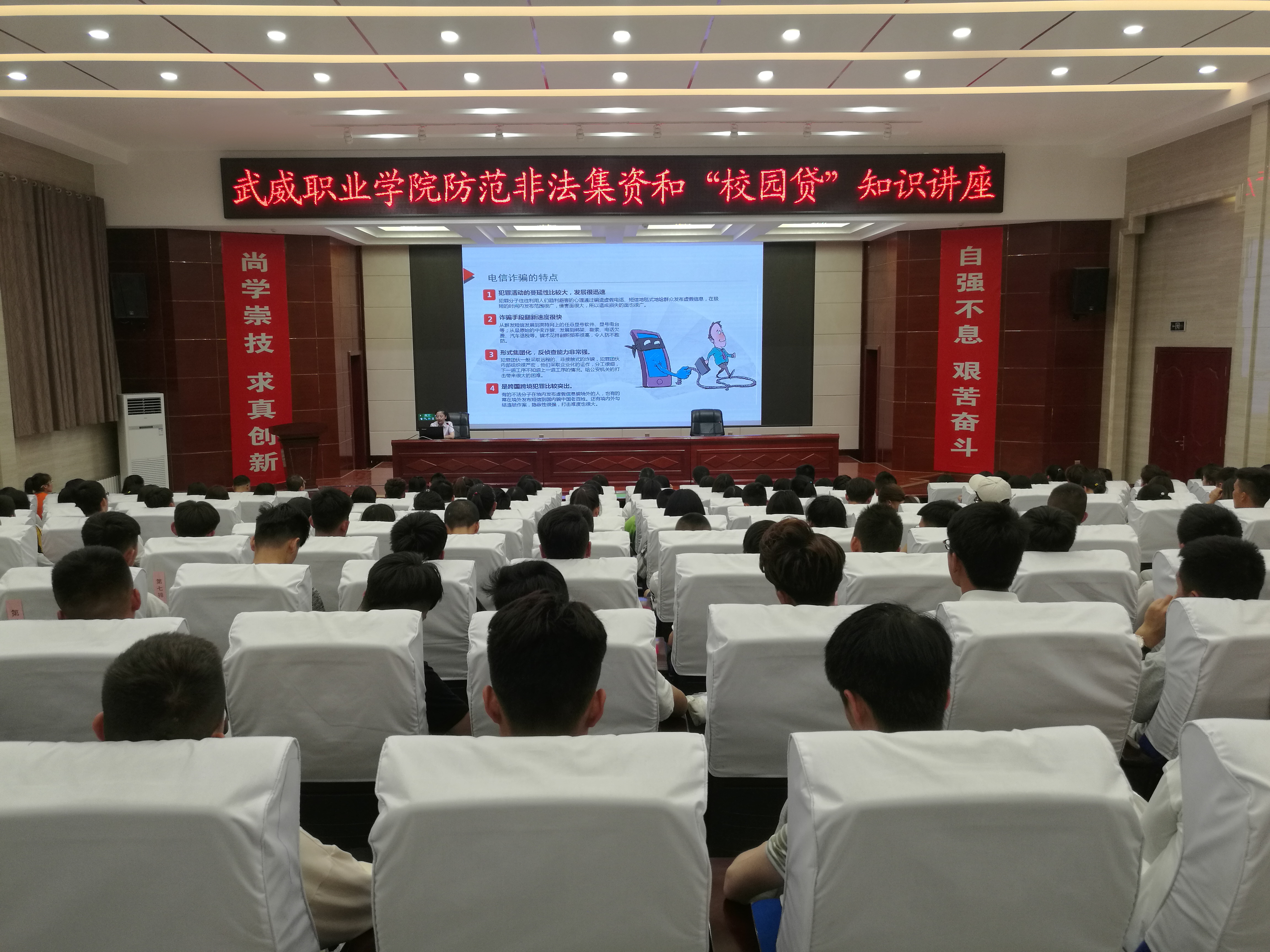 為深入貫徹落實(shí)甘肅省2019年防范非法集資和金融領(lǐng)域掃黑除惡宣傳月活動(dòng)的有關(guān)精神,保護(hù)廣大師生的合法權(quán)益。6月9日晚,學(xué)院邀請(qǐng)中國農(nóng)業(yè)銀行武威支行風(fēng)險(xiǎn)管理部工作人員朱琳在學(xué)院菁英廳作了關(guān)于防范非法集資和校園貸知識(shí)講座,學(xué)院副院長王永緒出席活動(dòng),保衛(wèi)處、計(jì)劃財(cái)務(wù)處負(fù)責(zé)同志及各系師生代表200余人聆聽了講座。