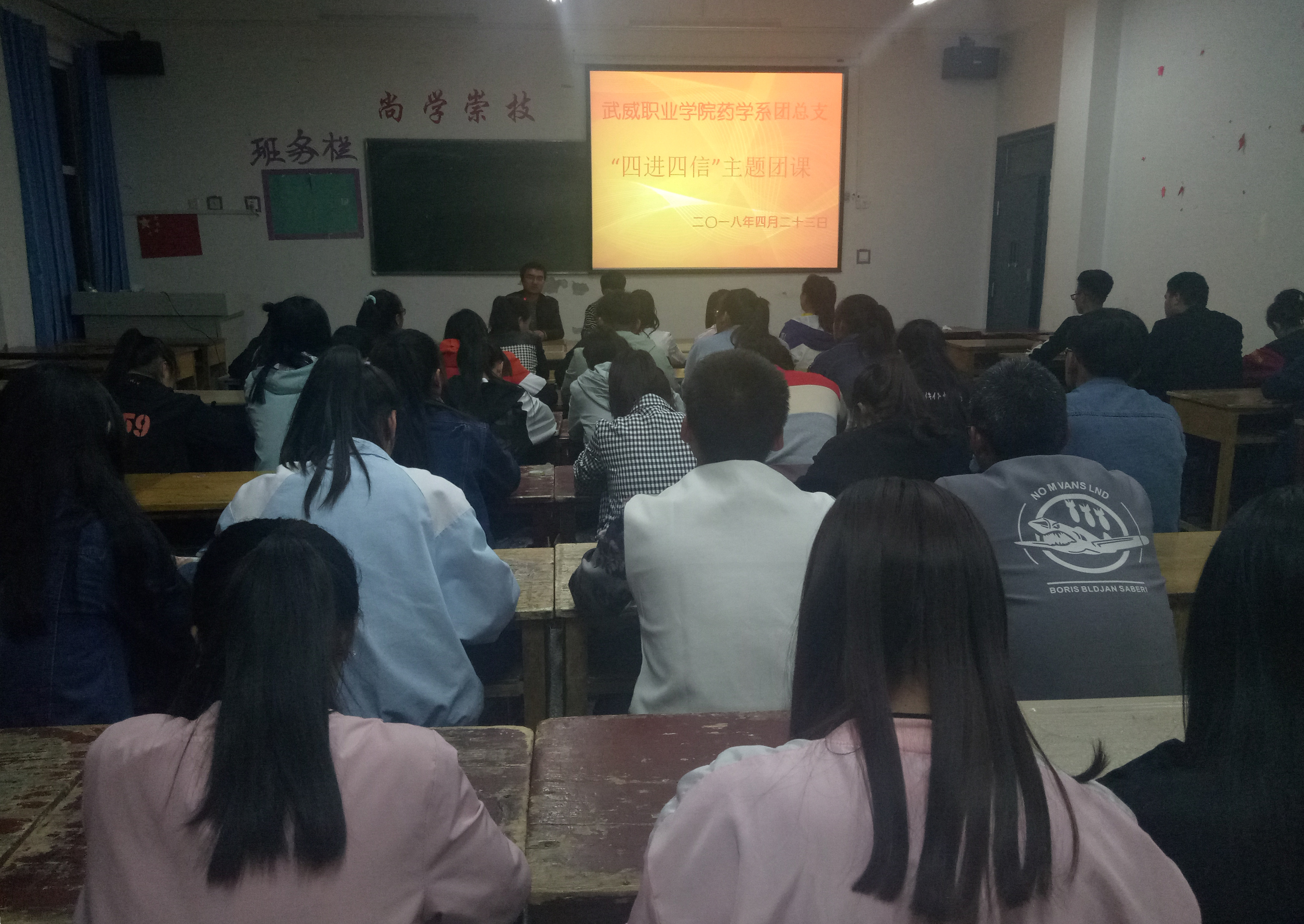 為深入學(xué)習(xí)宣傳貫徹習(xí)近平新時代中國特色社會主義思想,堅持以習(xí)近平新時代中國特色社會主義思想武裝團員干部和團員青年學(xué)生頭腦,積極推進各項工作開展。2018年4月23日晚,藥學(xué)系團總支組織16級團員青年及17級入團積極分子在明遠樓501教室開展關(guān)于“四進四信”的主題團課活動,團課由系團總支書記陳輝生主持。