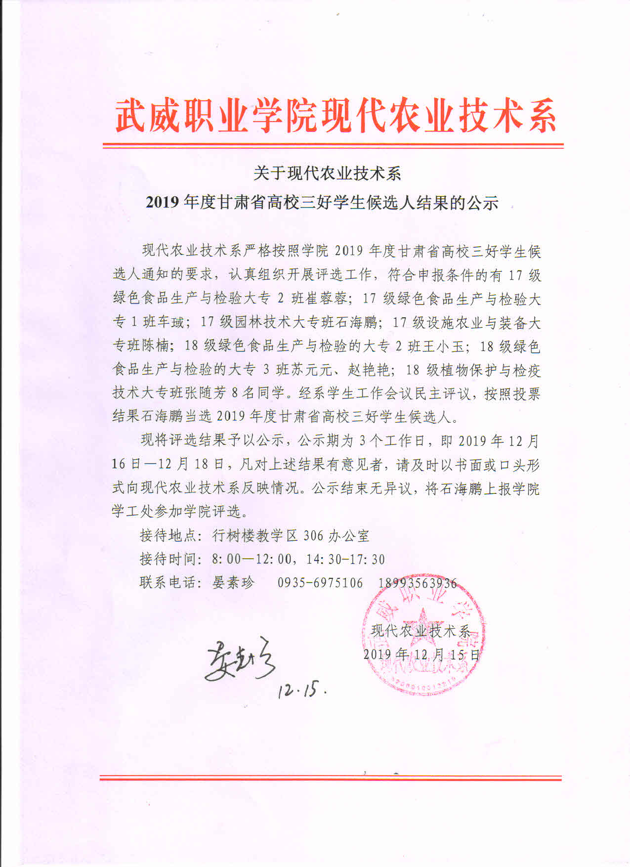 關(guān)于現(xiàn)代農(nóng)業(yè)技術(shù)系2019年度甘肅省高校三好學(xué)生候選人結(jié)果的公示