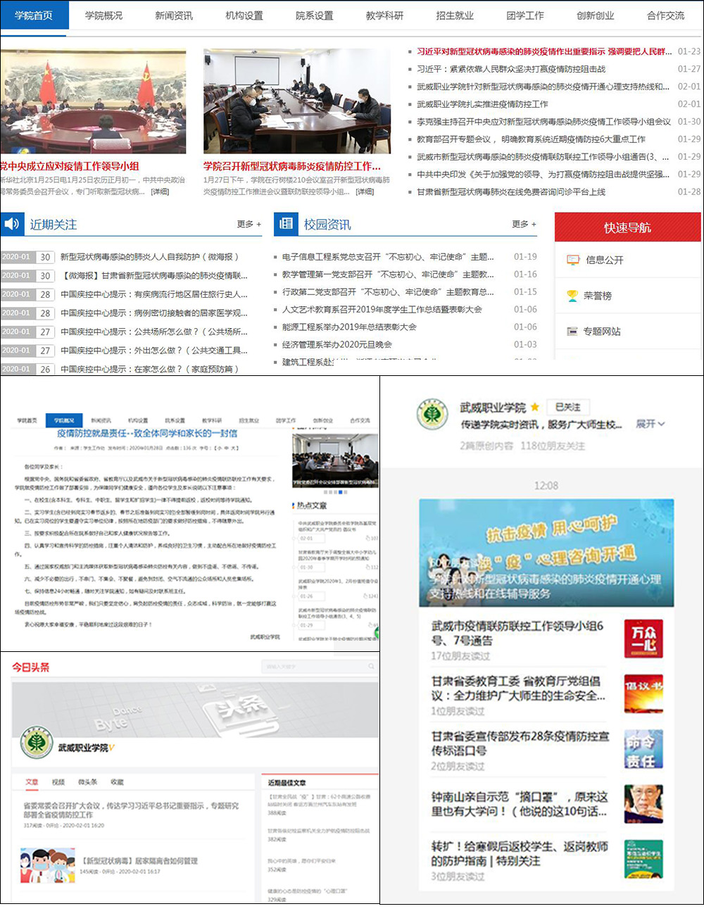 學(xué)院通過(guò)網(wǎng)站、微信公眾號(hào)、隴政釘、微信群、QQ群等平臺(tái),第一時(shí)間刊載轉(zhuǎn)發(fā)習(xí)近平總書(shū)記重要指示、李克強(qiáng)總理批示,中共中央、教育部、省委、省教育工委、武威市委關(guān)于做好新型冠狀病毒感染肺炎疫情防控工作的重要會(huì)議、文件、通知以及《武威職業(yè)學(xué)院致全體同學(xué)和家長(zhǎng)的一封信》《中共武威職業(yè)學(xué)院委員會(huì)致學(xué)院各基層黨組織和廣大共產(chǎn)黨員的倡議書(shū)》和防控知識(shí)50多條;做到宣傳教育和正面引導(dǎo)覆蓋到每一位教師、每一個(gè)班級(jí)、每一位學(xué)生,確保師生和學(xué)生家長(zhǎng)及時(shí)了解疫情發(fā)展態(tài)勢(shì)、臨床癥狀和學(xué)習(xí)掌握防控知識(shí);做到科學(xué)認(rèn)識(shí)、理性判斷、合理應(yīng)對(duì),不信謠、不傳謠,養(yǎng)成健康的防控生活習(xí)慣,堅(jiān)定信心、眾志成城防控疫情、戰(zhàn)勝疫情。