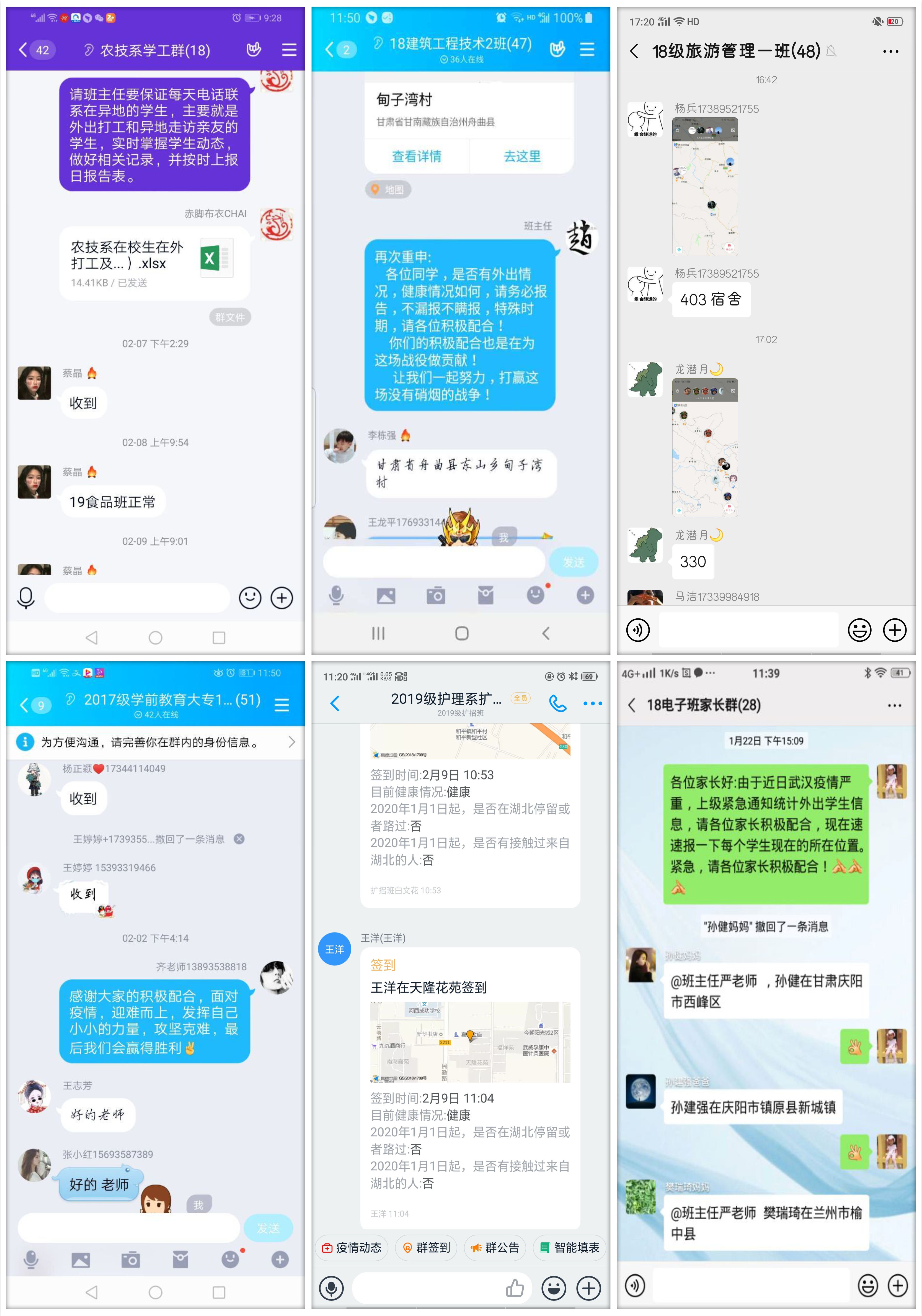 各院系輔導(dǎo)員和班主任每天都會不厭其煩的利用微信群、QQ群、釘釘群、電話等方式督促學(xué)生反饋動向和健康信息,清楚每一位學(xué)生當(dāng)日在何處,清楚每一位學(xué)生當(dāng)日是否健康,認(rèn)真核查確認(rèn)疫情數(shù)據(jù)信息,力求上報的每個疫情數(shù)據(jù)統(tǒng)計準(zhǔn)確無誤,為學(xué)校和上級部門的防控工作提供有力的數(shù)據(jù)支撐。