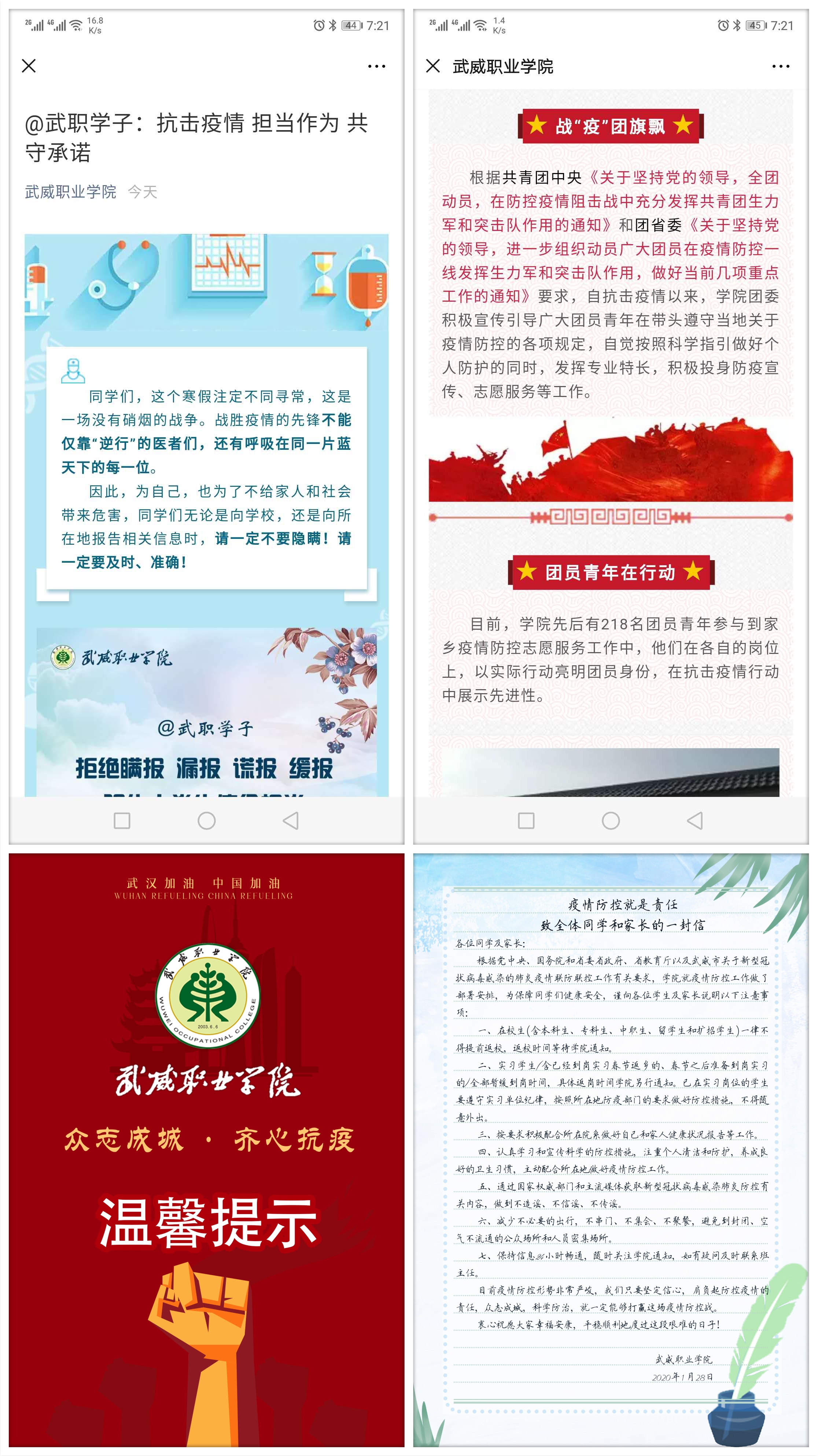學(xué)生工作處及時發(fā)布了致學(xué)生和家長的一封信《疫情防控就是責(zé)任》,團委制作和推送了《春暖花開疫情散 我們武職再相見》溫馨提示短片和《@武職學(xué)子:抗擊疫情 擔(dān)當(dāng)作為 共守承諾》倡議,用生動形象的表述要求和提醒同學(xué)們不得提前返校,做好個人防護措施,遵守當(dāng)?shù)匾咔榉揽馗黜椧?,做到不信謠不傳謠,及時向?qū)W院報送個人防疫相關(guān)信息,不瞞報不慌報。各院系輔導(dǎo)員和班主任都會第一時間在學(xué)生群里轉(zhuǎn)發(fā),同時把學(xué)院網(wǎng)站和微信平臺上科學(xué)的防控知識和上級的有關(guān)精神及時傳達(dá)給學(xué)生,當(dāng)好疫情防控的宣傳員,做到戰(zhàn)疫有“力”。