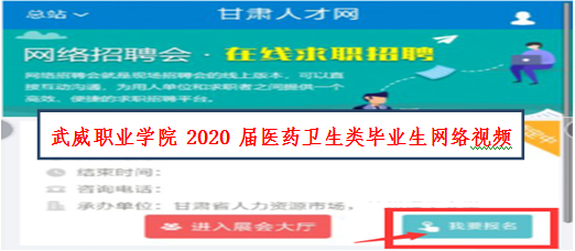 1.登錄甘肅人才網(wǎng)(www.gszhaopin.com),點擊菜單欄“招聘會”—“網(wǎng)絡(luò)招聘會”進(jìn)入二級頁面菜單,進(jìn)入網(wǎng)絡(luò)招聘會列表—選擇“武威職業(yè)學(xué)院2020屆醫(yī)藥衛(wèi)生類畢業(yè)生網(wǎng)絡(luò)視頻雙選會”點擊“我要報名”按鈕,登錄企業(yè)后臺(無賬號點擊“立即注冊”,資質(zhì)通過審核后再報名),待定審核。