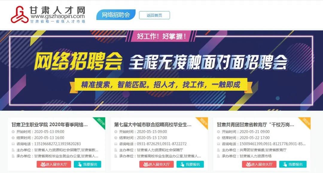 為應(yīng)對(duì)新冠肺炎疫情沖擊,加大高校畢業(yè)生就業(yè)服務(wù)力度,進(jìn)一步做好高校畢業(yè)生就業(yè)服務(wù)工作,甘肅省高校畢業(yè)生就業(yè)辦公室、甘肅省人力資源市場(chǎng)定于2020年5月15日聯(lián)合甘肅省內(nèi)部分高校在甘肅人才網(wǎng)(www.gszhaopin.com)舉辦“第七屆大中城市聯(lián)合招聘高校畢業(yè)生春季網(wǎng)絡(luò)視頻專場(chǎng)招聘會(huì)‘甘肅站’”活動(dòng)。