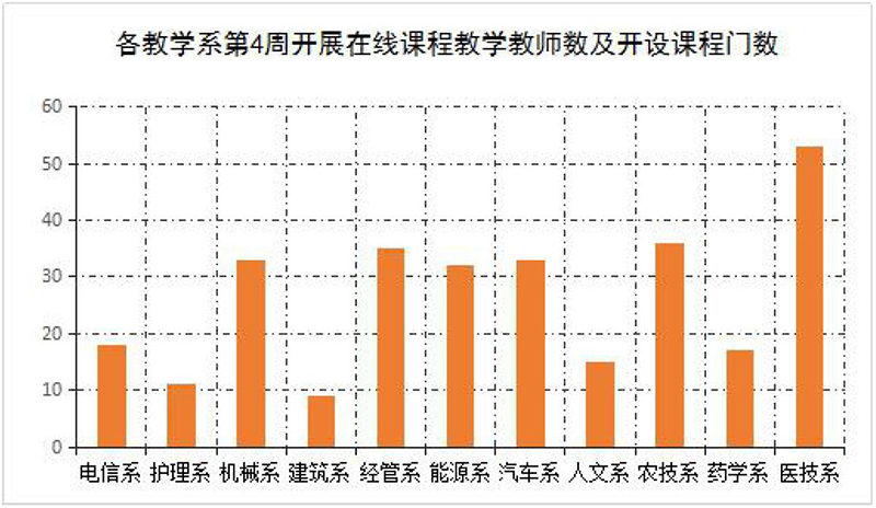 第4周,各教學(xué)系在線課程按照教學(xué)安排全部上線運(yùn)行,實(shí)際開課315門,較第1-2周(284門次)有所增加。在線課程達(dá)到“應(yīng)開盡開”的目標(biāo),全部在線課程整體運(yùn)行平穩(wěn)有序。本周授課總學(xué)時(shí)達(dá)到1681學(xué)時(shí),教師參加在線授課共計(jì)1631人次。