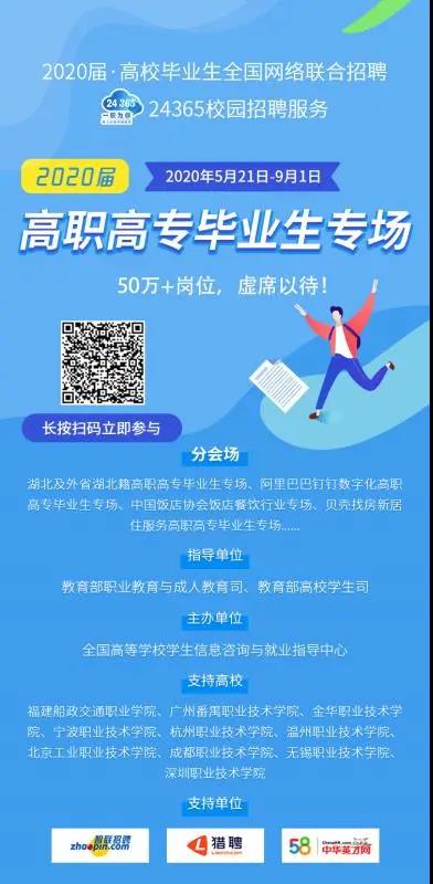 為了進(jìn)一步促進(jìn)2020屆高職高專畢業(yè)生就業(yè),教育部高校學(xué)生司和職業(yè)教育與成人教育司聯(lián)合推出“高職高專畢業(yè)生專場招聘會(huì)”,首批推出崗位超過50萬個(gè)。畢業(yè)生可登錄教育部大學(xué)生就業(yè)網(wǎng)(新職業(yè)網(wǎng)www.ncss.cn)或直接掃描宣傳頁中的二維碼參與活動(dòng)。