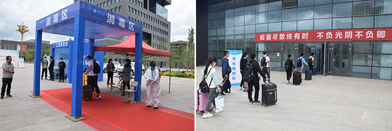 學院在校門口設置了測溫通道,消毒區(qū)、口罩發(fā)放區(qū)、臨時觀察區(qū)等,為同學們的健康安全保駕護航。學生到校后,依次通過測溫區(qū)、消毒區(qū),經(jīng)工作人員嚴格的測溫和消毒后,更換口罩到指定地點報到。