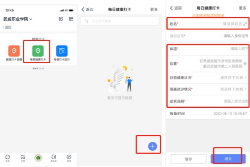 2.每日健康打卡:點(diǎn)擊每日健康打開——點(diǎn)擊右下角?號(hào)——點(diǎn)擊姓名框選擇姓名——填寫內(nèi)容——提交。