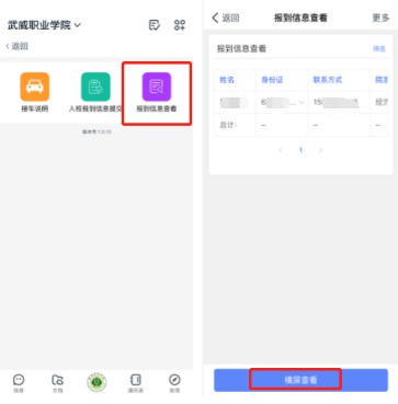 3.報(bào)到信息查看:點(diǎn)擊報(bào)到信息查看——查看報(bào)到明細(xì)(院系、班級(jí)、宿舍等信息)。