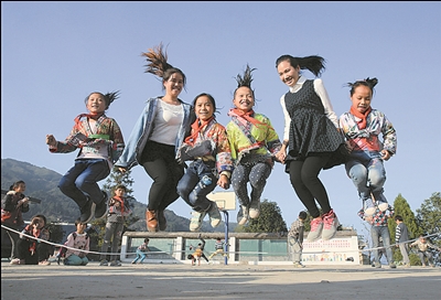 ⑤ 廣西柳州市融水苗族自治縣大年鄉(xiāng)高馬村小學(xué)師生一起開展體育活動(dòng)。