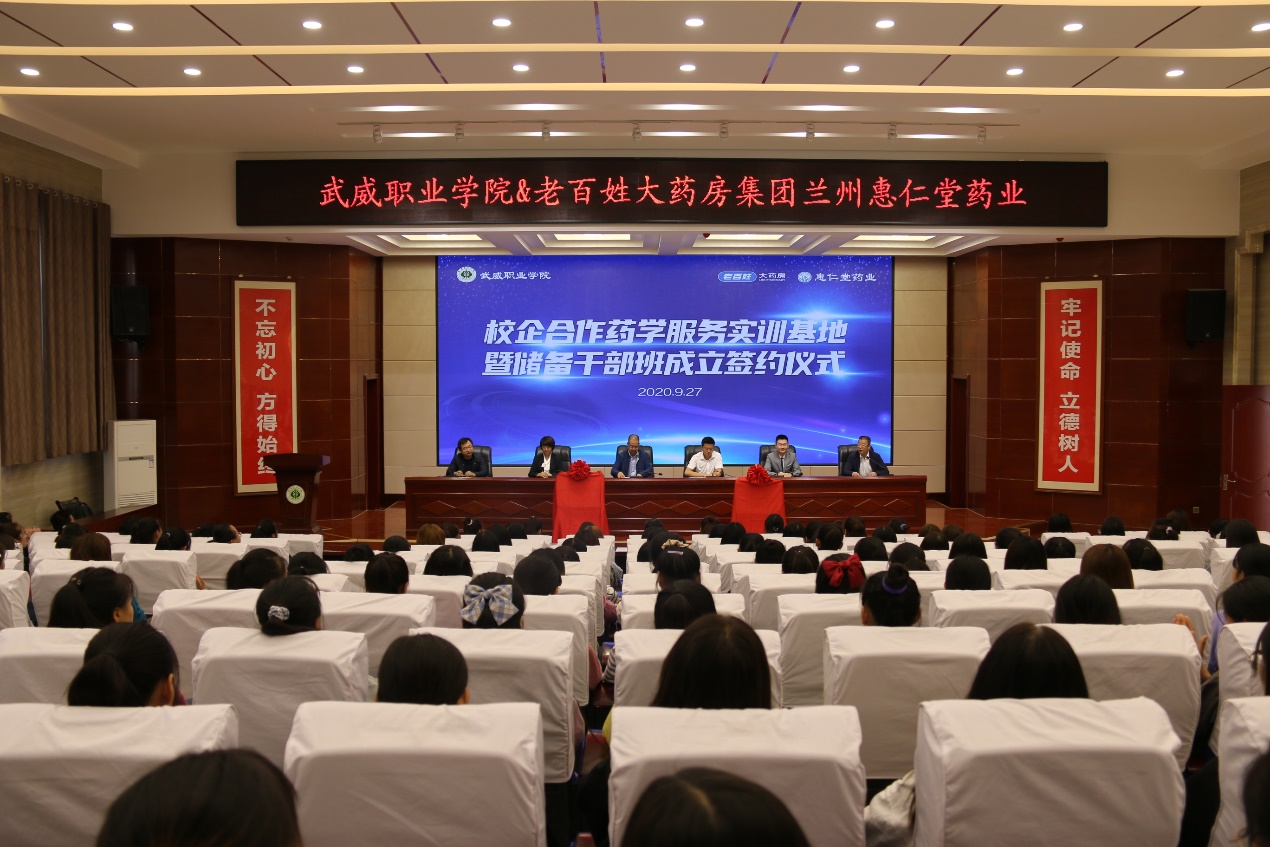 2020年9月27日上午,學院與老百姓集團﹒蘭州惠仁堂藥業(yè)連鎖有限責任公司“校企共建藥學實訓基地”暨“老百姓儲備干部班”成立簽約儀式在大學生活動中心菁英廳舉行。儀式由藥學系主任魏潤明主持,學院黨委副書記翟存祥、老百姓集團總部和蘭州惠仁堂藥業(yè)公司相關(guān)領(lǐng)導(dǎo)出席,藥學系教師代表和2019級藥學、中藥學專業(yè)學生代表共計220人參加了簽約儀式。