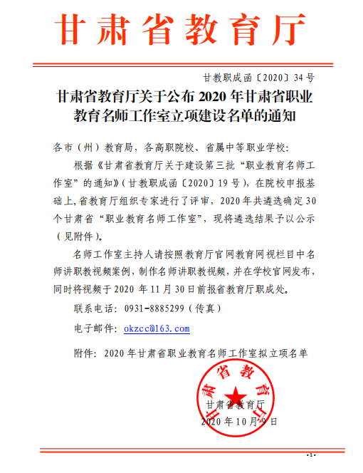 甘肅省教育廳關(guān)于公布 2020 年甘肅省職業(yè) 教育名師工作室立項(xiàng)建設(shè)名單的通知