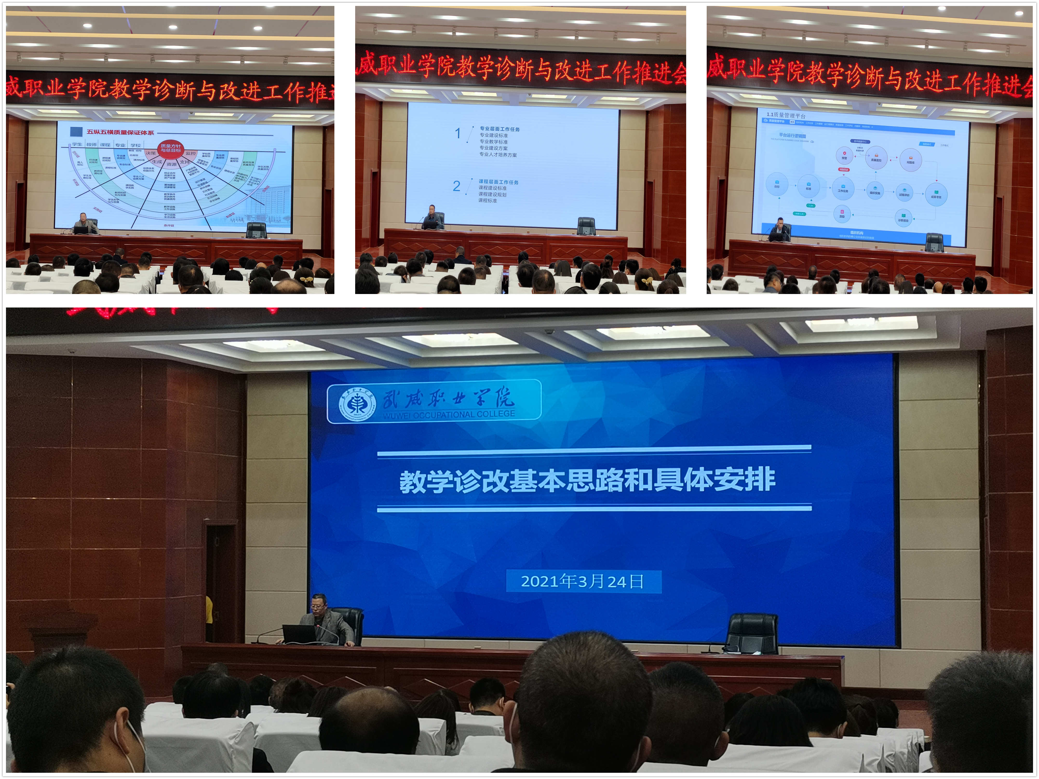 會上,質(zhì)量管理辦公室主任魏潤明以《教學(xué)診改基本思路和具體安排》為題匯報了構(gòu)建“五縱五橫”內(nèi)部質(zhì)量保證體系、梳理學(xué)院事業(yè)發(fā)展規(guī)劃打造“目標(biāo)鏈”、建立標(biāo)準(zhǔn)體系做實“目標(biāo)鏈”及具體安排;教務(wù)處副處長張世亮以《學(xué)院專業(yè)與課程層面教學(xué)診斷工作實施思路》為題重點匯報了學(xué)院專業(yè)、課程層面當(dāng)前面臨的診改工作和開展情況及下一步工作安排;診改智能化信息管理平臺建設(shè)服務(wù)負(fù)責(zé)人就診改平臺基本架構(gòu)、模塊功能、常見問題等做了介紹。