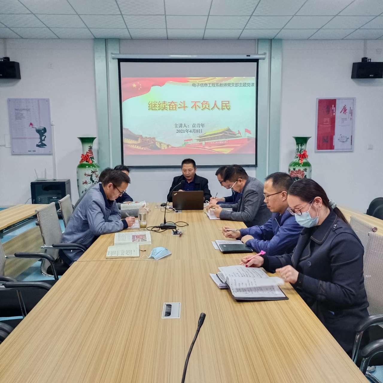 4月8日,電子信息工程系黨總支開展黨總支書記講黨課活動,全體教師黨員參加了學(xué)習(xí)。電子信息工程系黨總支書記袁青年同志以“繼續(xù)奮斗、不負(fù)人民”主題講了黨課。