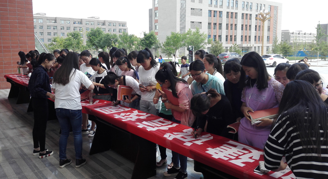 6月14日是第九個(gè)全國(guó)“信用記錄關(guān)愛日”。為進(jìn)一步加強(qiáng)我院學(xué)生的誠信教育,結(jié)合當(dāng)前學(xué)院正在進(jìn)行的社會(huì)信用體系建設(shè)及國(guó)家助學(xué)貸款工作,當(dāng)日中午12時(shí),學(xué)生工作處在大學(xué)生活動(dòng)中心廣場(chǎng)發(fā)起“創(chuàng)建誠信校園 樹立誠信學(xué)風(fēng) 做誠信學(xué)子”的主題簽名倡議活動(dòng)。200多名學(xué)生頂著炎炎烈日前來參加簽名活動(dòng),并在橫幅上鄭重簽下了自己的名字。