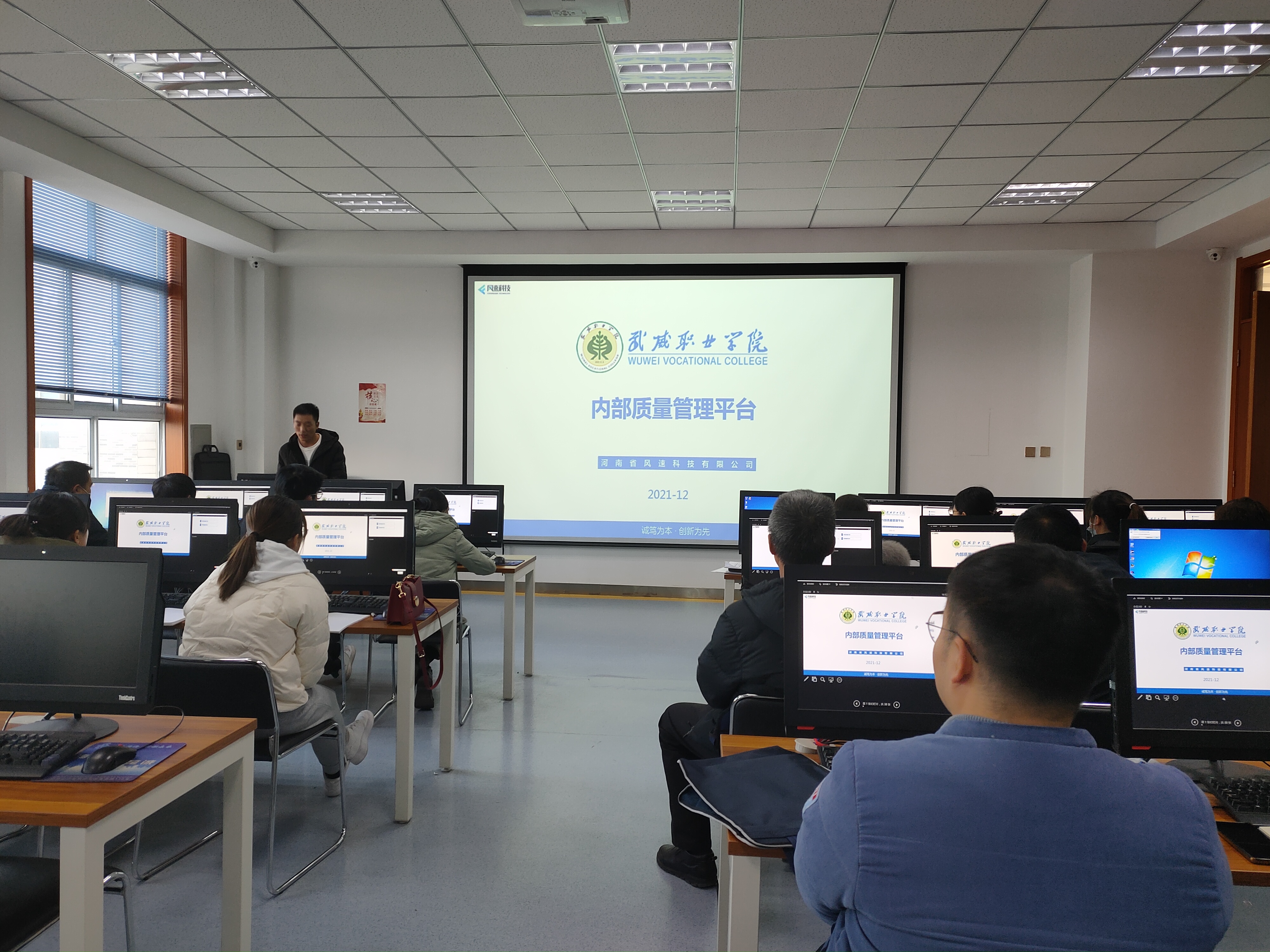 風(fēng)速科技有限公司項目經(jīng)理徐來彬?qū)處熯M行了培訓(xùn)。重點介紹了內(nèi)部質(zhì)量管理平臺整體架構(gòu)、主要功能、任務(wù)提取、上傳、轉(zhuǎn)辦,任務(wù)辦理與審核、通報、文檔庫上傳與使用、績效考核等,并進行現(xiàn)場操作演示,就參會教師存在的問題進行了溝通交流。