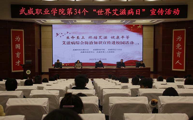 11月30日,學(xué)院在菁英廳開展了“生命至上 終結(jié)艾滋 健康平等”艾滋病綜合防治知識宣傳進(jìn)校園活動(dòng)。市疾控中心工會(huì)主席張富國、市婦聯(lián)副主席張惠華、學(xué)院黨委委員、副院長王守云,市第二人民醫(yī)院院長滕亮出席活動(dòng),活動(dòng)由學(xué)院護(hù)理系黨總支書記張建輝主持,市紅十字會(huì)、市疾控中心、天馬行市民云數(shù)據(jù)有限公司工作人員及武威職業(yè)學(xué)院師生代表參加活動(dòng)。
