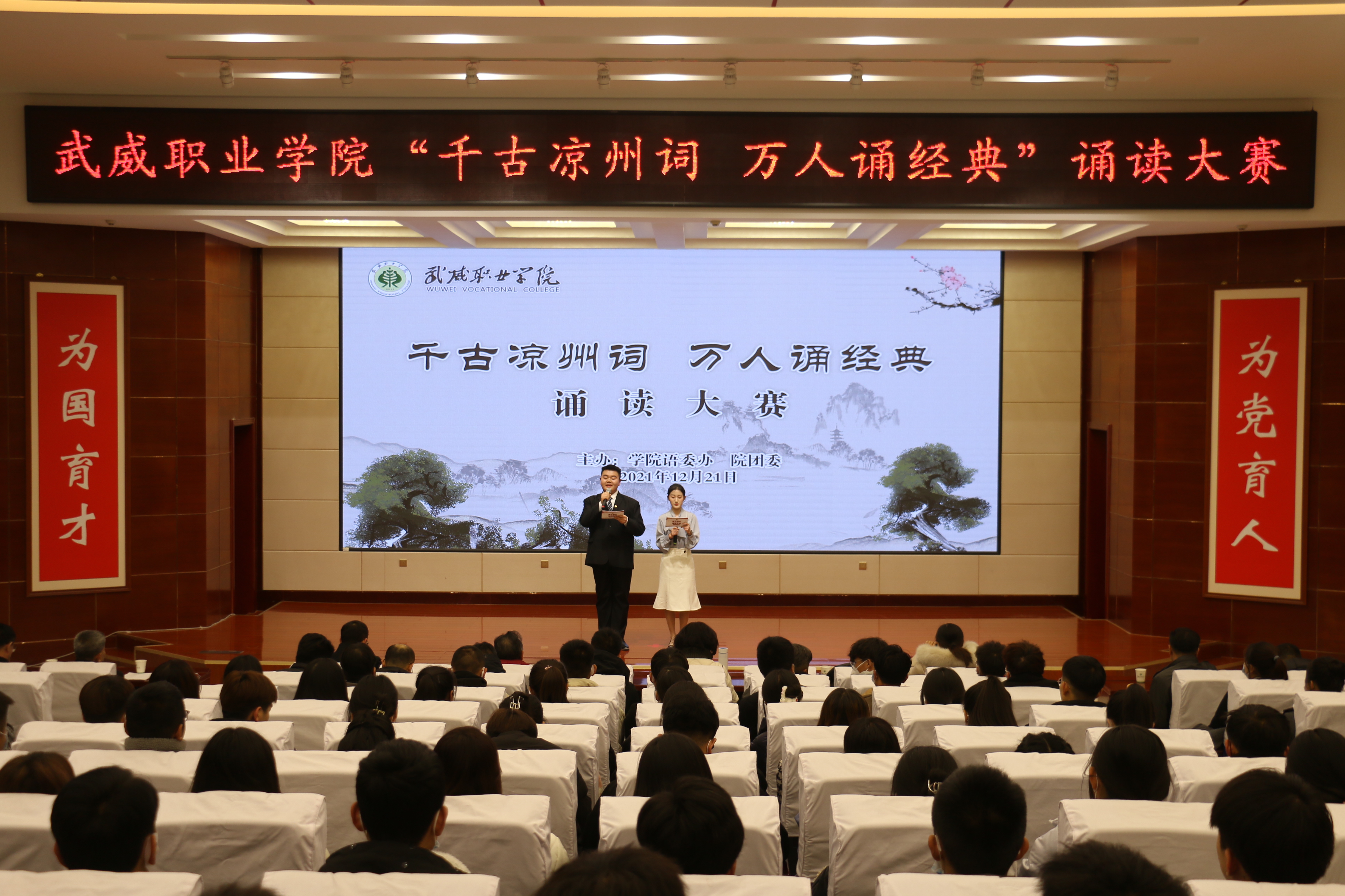 為深化黨史學習教育,推進“雙高計劃”建設任務,弘揚涼州文化,傳承絲路精神,助推全國文明城市創(chuàng)建,營造書香校園氛圍,12月21日晚,學院“千古涼州詞 萬人誦經(jīng)典”誦讀大賽在菁英廳舉辦,學院黨委書記、院長趙明,黨委委員、副院長張開禮,黨委委員、副院長王守云出席活動,各分團委書記及學生代表250余人觀看比賽。