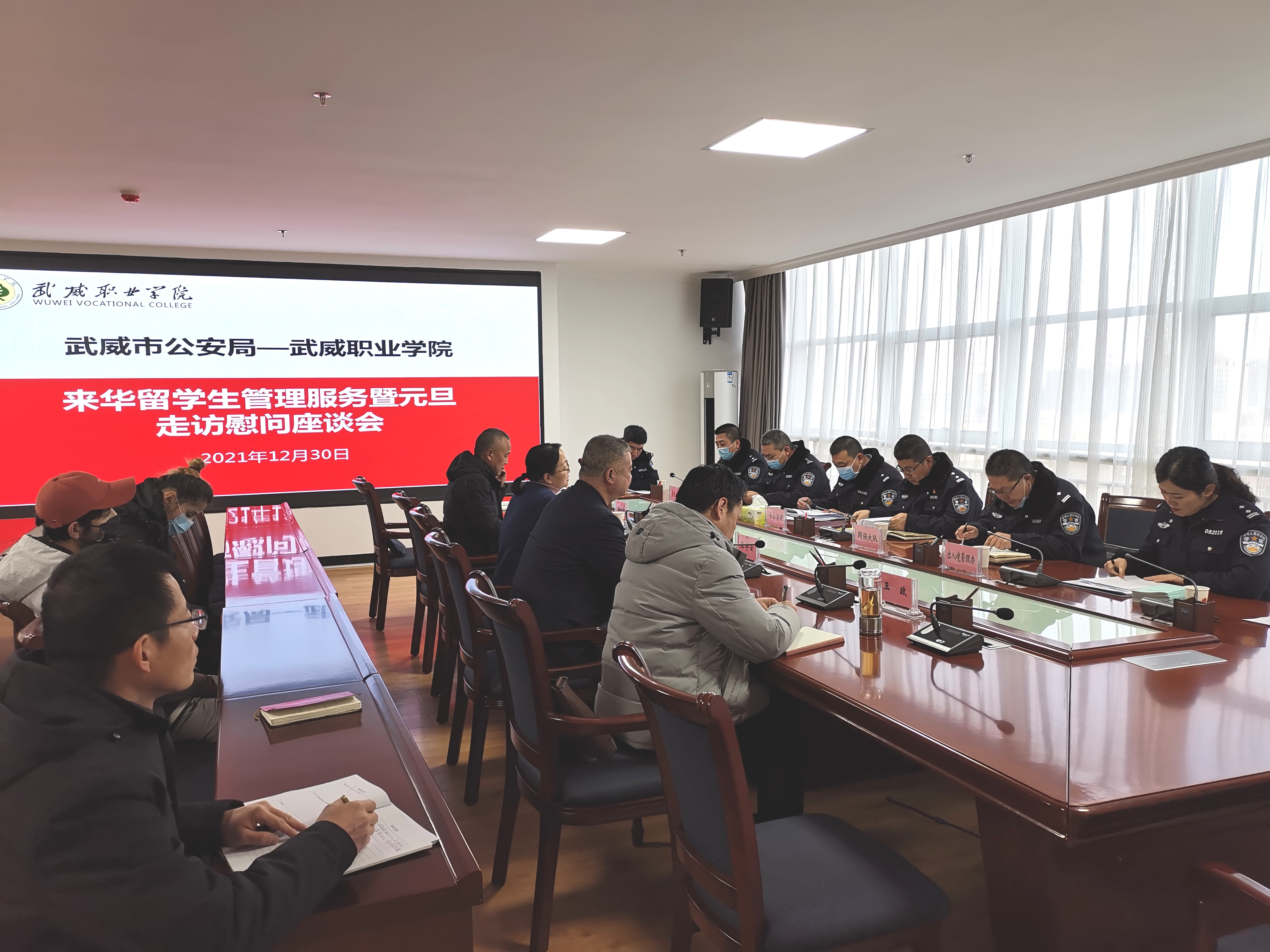 12月30日上午,市公安局出入境管理科、非政府組織管理辦公室,市公安局涼州分局國安大隊(duì)、反恐大隊(duì)、出入境管理辦公室、涼州分局西關(guān)街派出所一行十一人到訪學(xué)院,開展來華留學(xué)生管理服務(wù)暨元旦走訪慰問活動。黨委委員、副院長田迎春、王守云出席活動。國際合作與交流處處長潘從民、保衛(wèi)處處長王政及相關(guān)人員,2019級、2021級在華留學(xué)生參加活動。田迎春主持活動。