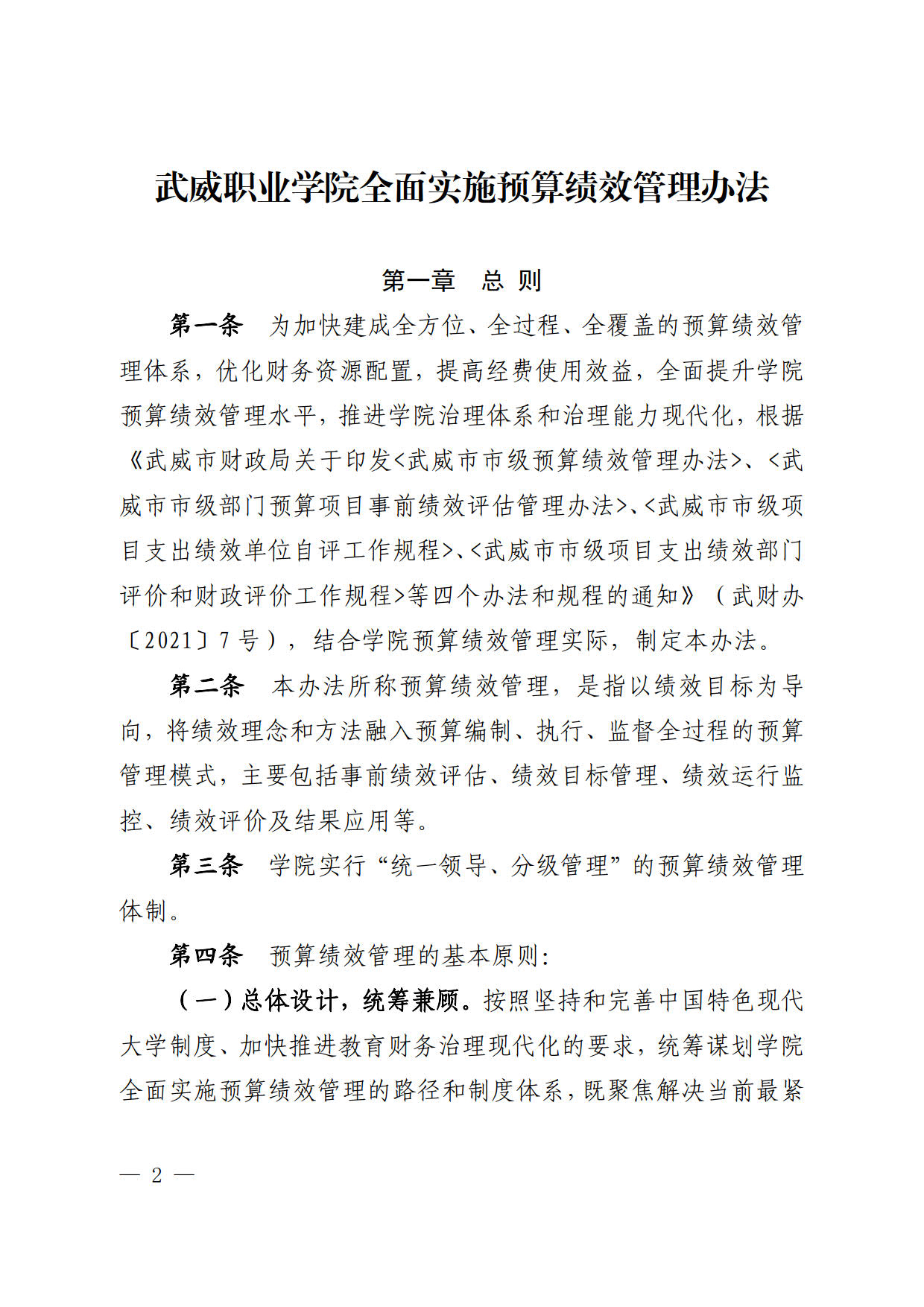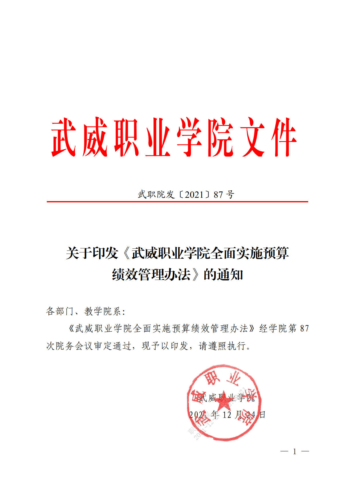 關于印發(fā)《武威職業(yè)學院全面實施預算績效管理辦法》的通知