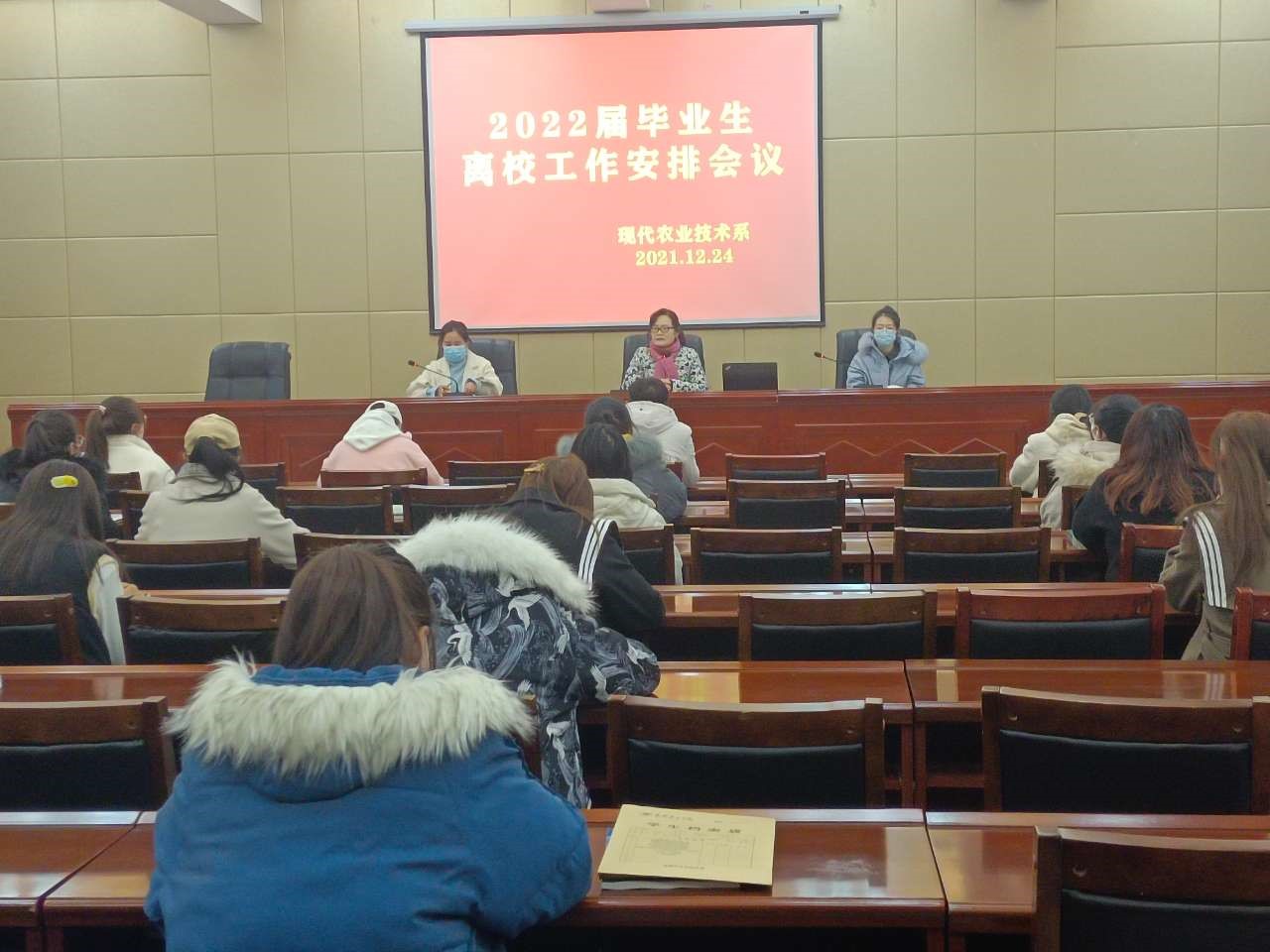 為確保2022屆畢業(yè)生離校工作安全穩(wěn)定、平安有序地進(jìn)行,12月24日上午,現(xiàn)代農(nóng)業(yè)技術(shù)系黨總支書記晏素珍在行樹樓北側(cè)報告廳組織召開2022屆畢業(yè)生離校工作安排會議,畢業(yè)班班主任和全體畢業(yè)生參加了會議。
