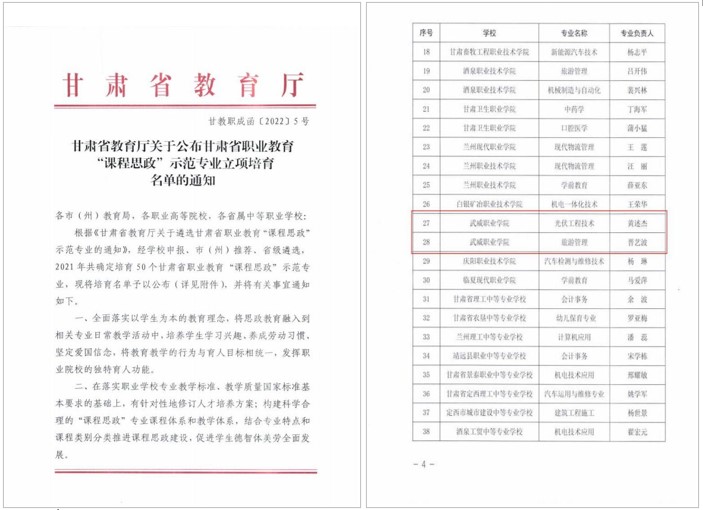 中科低碳新能源技術(shù)學(xué)院黃述杰負(fù)責(zé)的“光伏工程技術(shù)”和經(jīng)濟(jì)管理學(xué)院晉藝波負(fù)責(zé)的“旅游管理”2個(gè)專(zhuān)業(yè)獲評(píng)甘肅省職業(yè)教育“課程思政”示范專(zhuān)業(yè)。