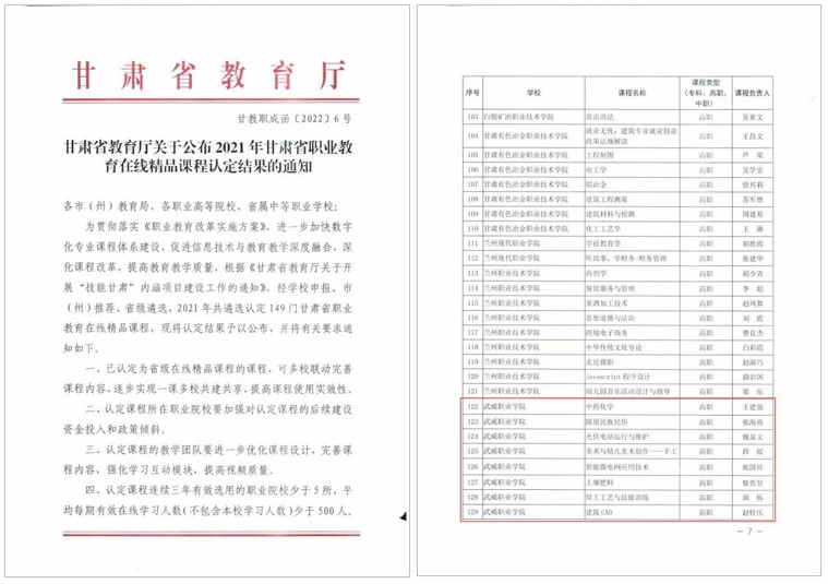藥學(xué)院王建強(qiáng)負(fù)責(zé)的《中藥化學(xué)》、經(jīng)濟(jì)管理學(xué)院張海燕負(fù)責(zé)的《隴原民族民俗》、中科低碳新能源技術(shù)學(xué)院魏顯文負(fù)責(zé)的《光伏電站運(yùn)行與維護(hù)》、張國(guó)祥負(fù)責(zé)的《智能微電網(wǎng)應(yīng)用技術(shù)》、藝術(shù)與教育學(xué)院薛媛負(fù)責(zé)的《美術(shù)與幼兒美術(shù)創(chuàng)作——手工》、現(xiàn)代農(nóng)業(yè)學(xué)院柴貴賢負(fù)責(zé)的《土壤肥料》、工程技術(shù)學(xué)院頡棟負(fù)責(zé)的《焊接工藝與技能訓(xùn)練》、趙特慶負(fù)責(zé)的《建筑CAD》8門(mén)課程獲評(píng)甘肅職業(yè)教育在線(xiàn)精品課程。