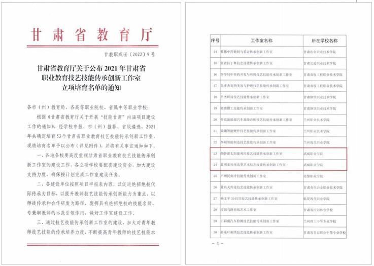 創(chuàng)新創(chuàng)業(yè)中心顏魯薪負(fù)責(zé)的“顏魯薪太陽(yáng)能利用技藝技能傳承創(chuàng)新工作室”和藝術(shù)與教育學(xué)院藍(lán)明東負(fù)責(zé)的“藍(lán)明東傳統(tǒng)造型藝術(shù)技藝技能傳承創(chuàng)新工作室”獲評(píng)甘肅省職業(yè)教育技藝技能傳承創(chuàng)新工作室。