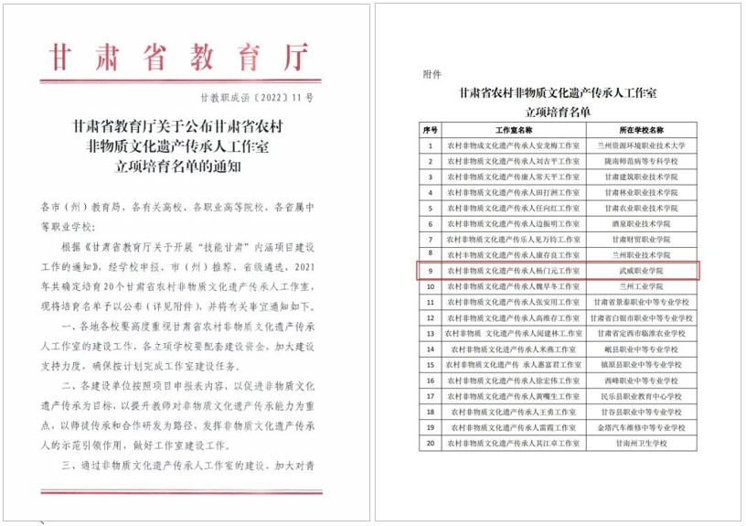 國(guó)家級(jí)非物質(zhì)文化遺產(chǎn)傳承人、學(xué)校攻鼓子藝術(shù)團(tuán)指導(dǎo)教師楊門(mén)元合作申報(bào)的“農(nóng)村非物質(zhì)文化遺產(chǎn)傳承人楊門(mén)元工作室”,獲評(píng)甘肅省農(nóng)村非物質(zhì)文化遺產(chǎn)傳承人工作室。
